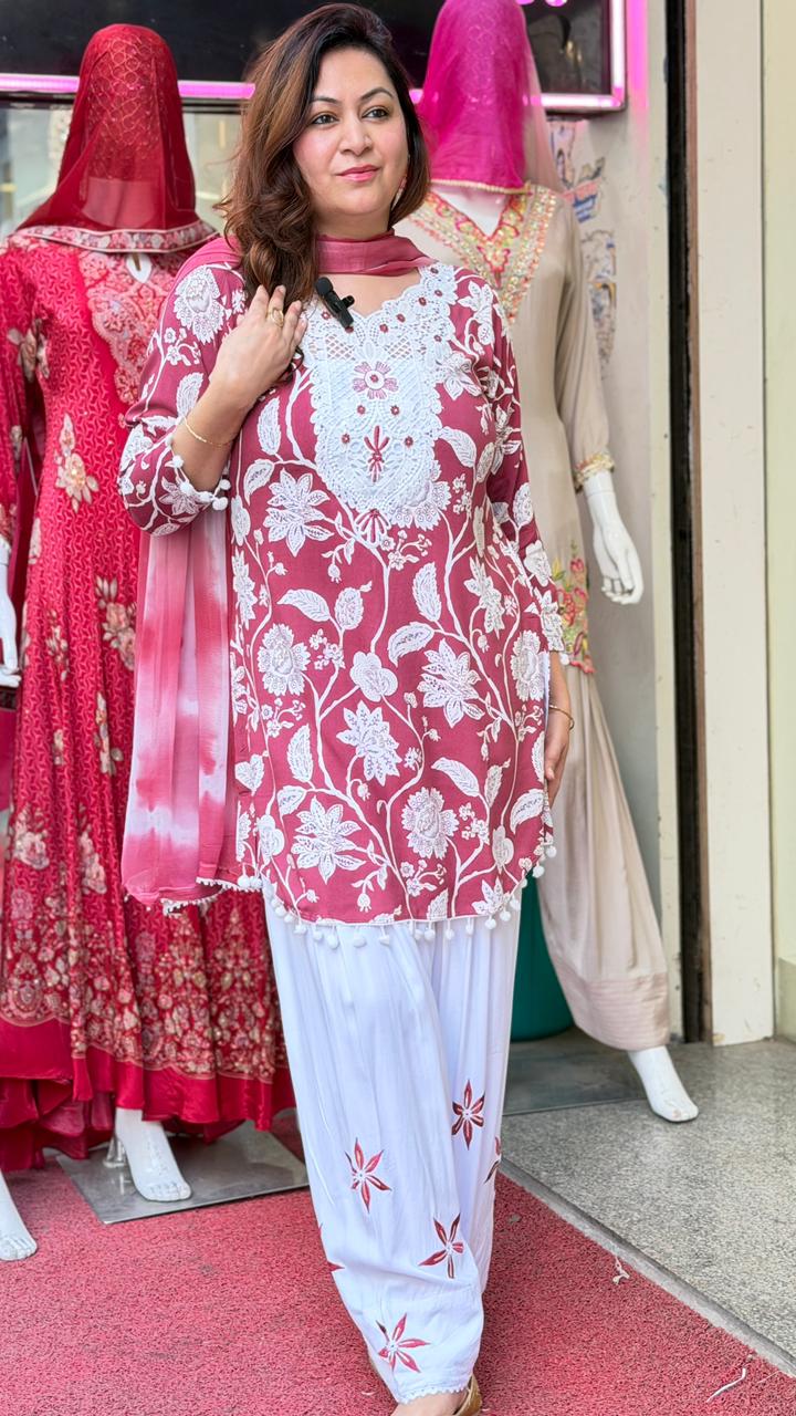 Rose Pink Floral Printed Kurta Set with White Palazzo & Dupatta