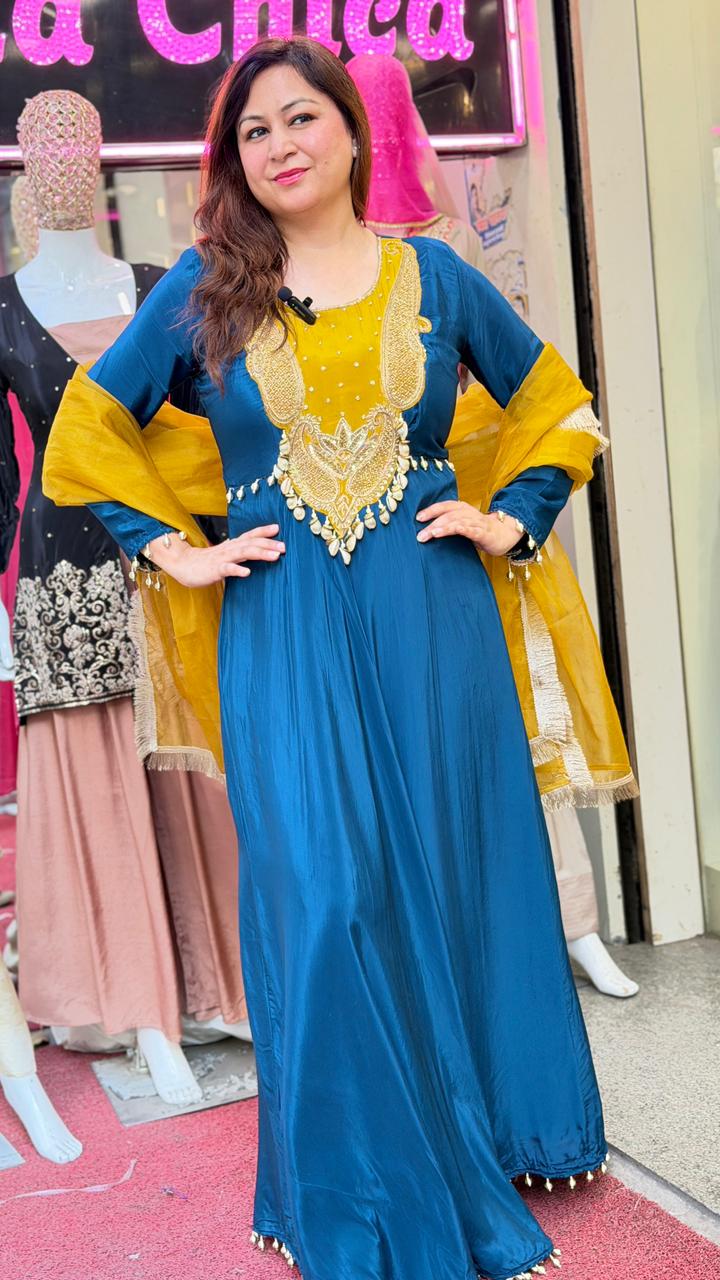 Teal & Mustard Embroidered Anarkali Dress with Dupatta