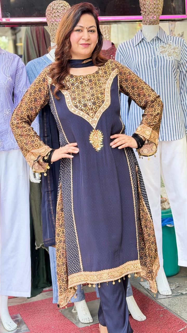 Step out in timeless style with this beautifully crafted navy blue kurta set. Featuring intricate...