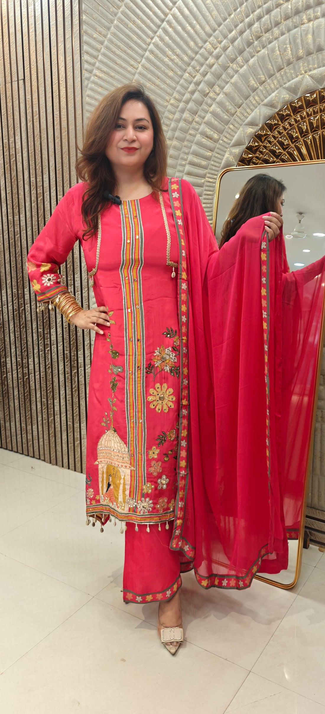 Celebrate tradition with a modern flair in our Pink A-Line Embroidered Suit Set. Crafted in...