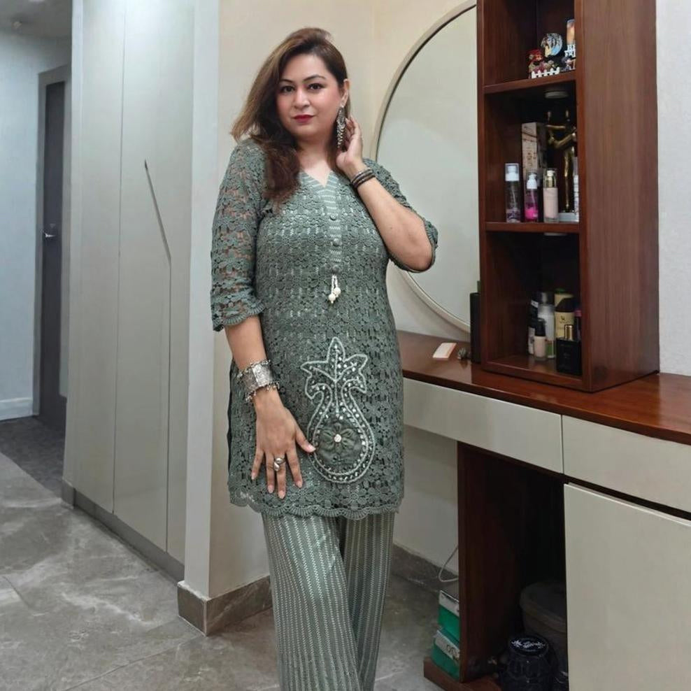 Breathe elegance into every occasion with ourย Croshiya Coord Set. Crafted with intricate daisy-pattern crochet lace...