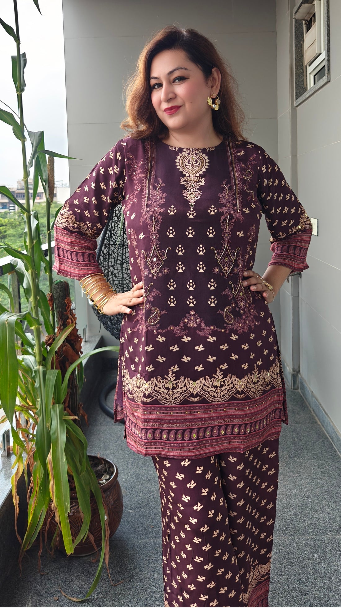 Elevate your festive charm with our Crepe Thumak Coord Set, designed in a rich wine...