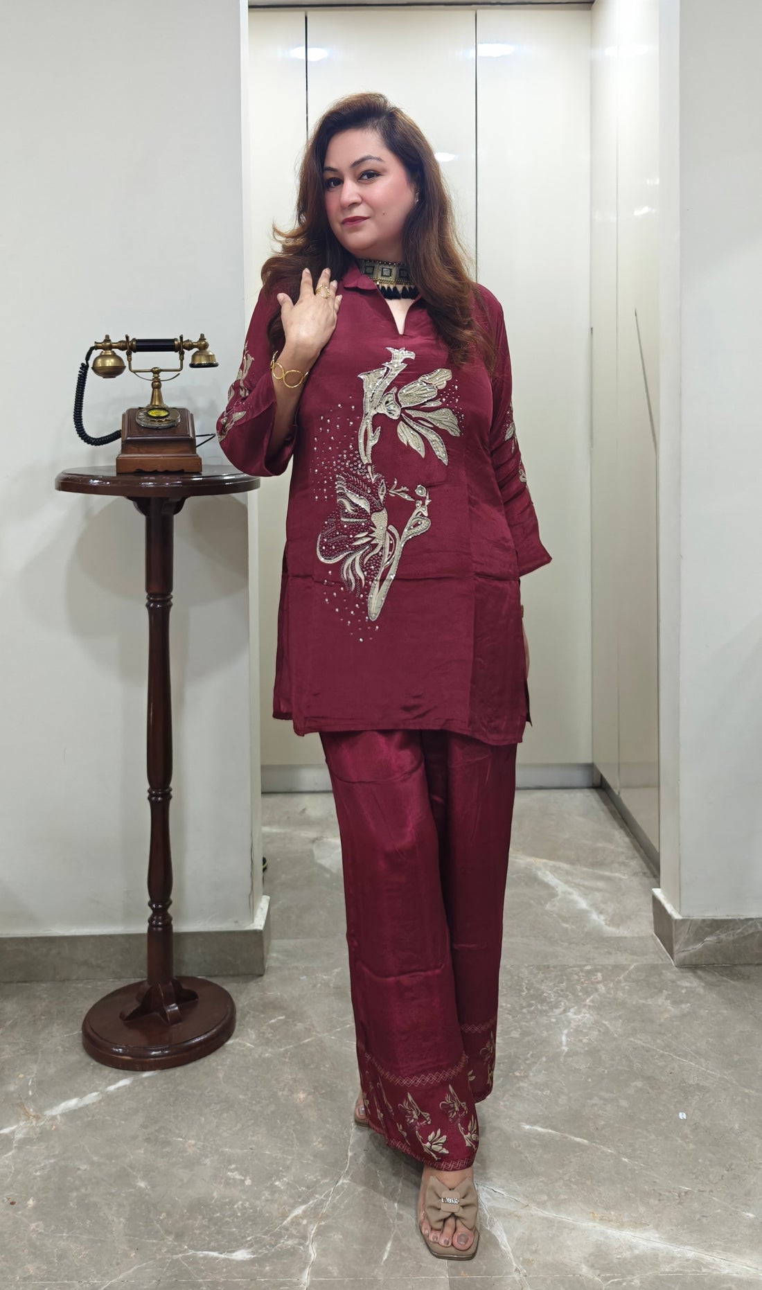 Redefine elegance with our Crepe Audio Coord Set, crafted in a rich wine hue that...