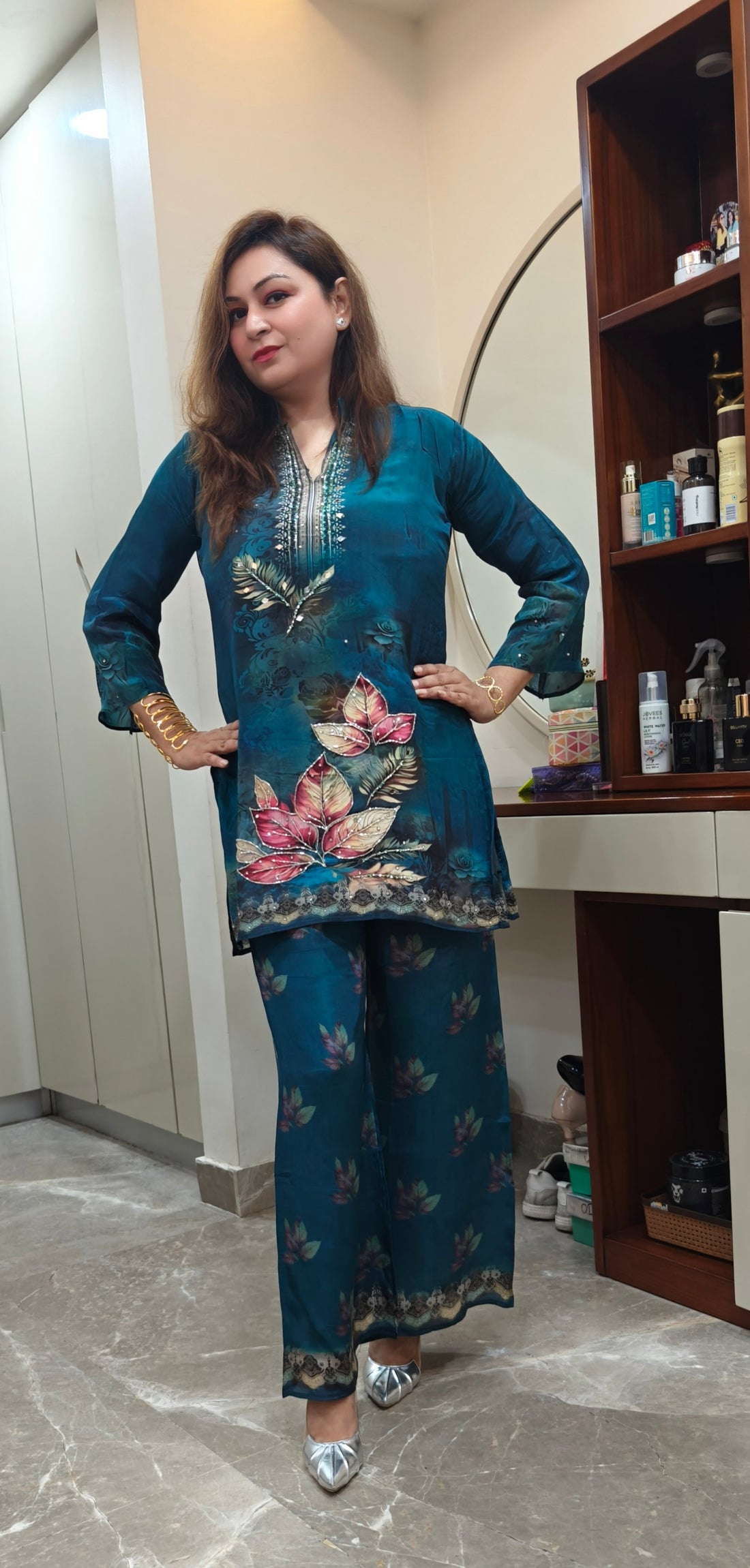 Step into elegance with our Emerald Bloom Crepe Coord Set, designed in a deep teal...