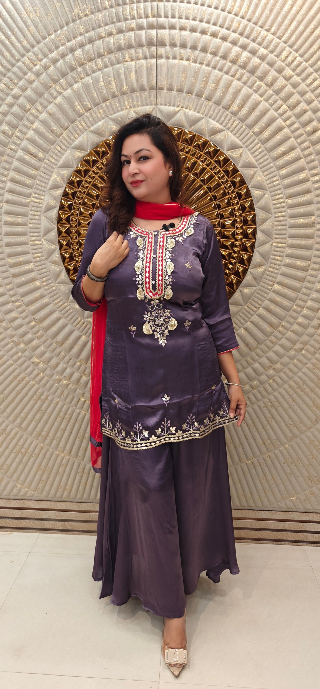 Elevate your festive wardrobe with our Gota Patti Short Sharara Suit in a rich, elegant...