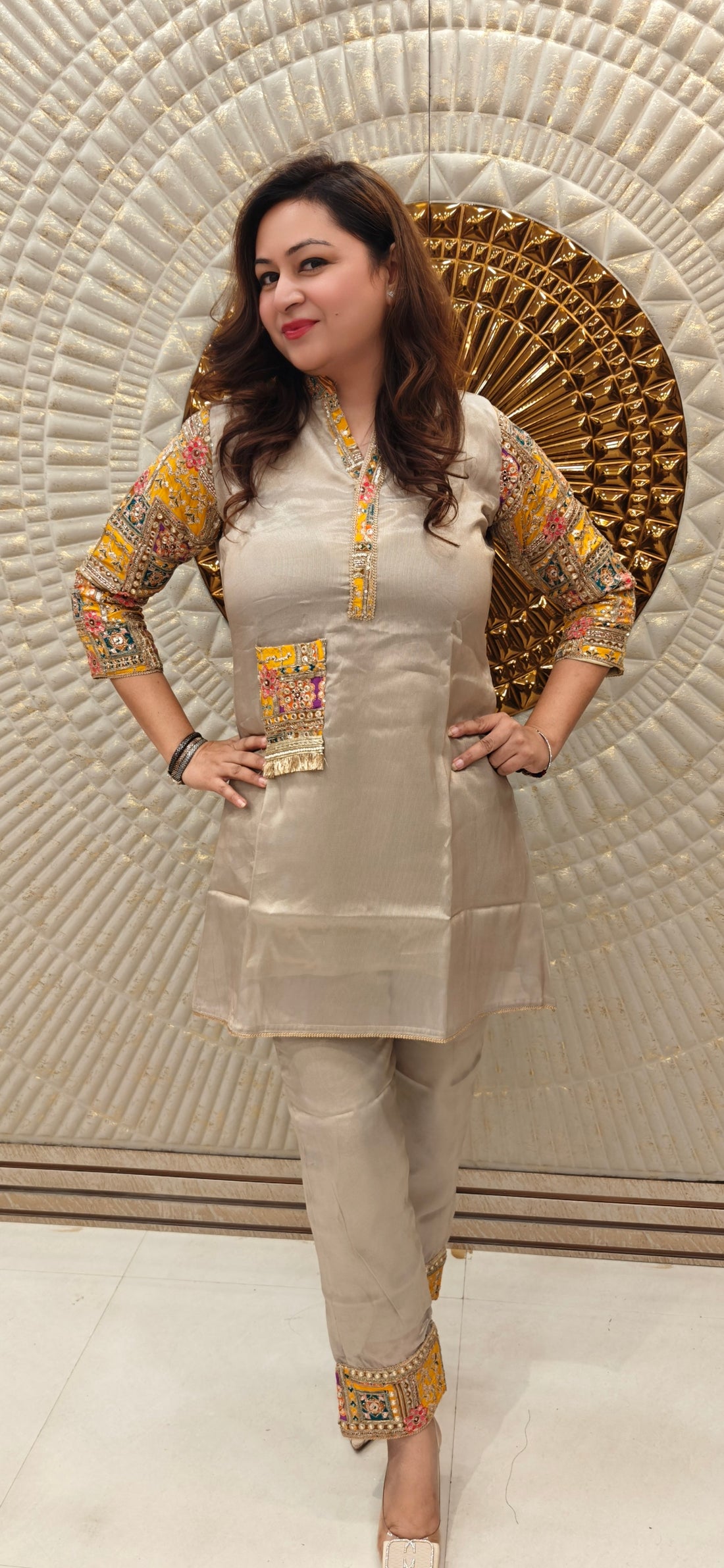 Step into contemporary elegance with our Golden Jacquard Pleated Skirt Coord Set, designed to blend...