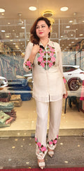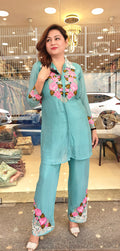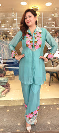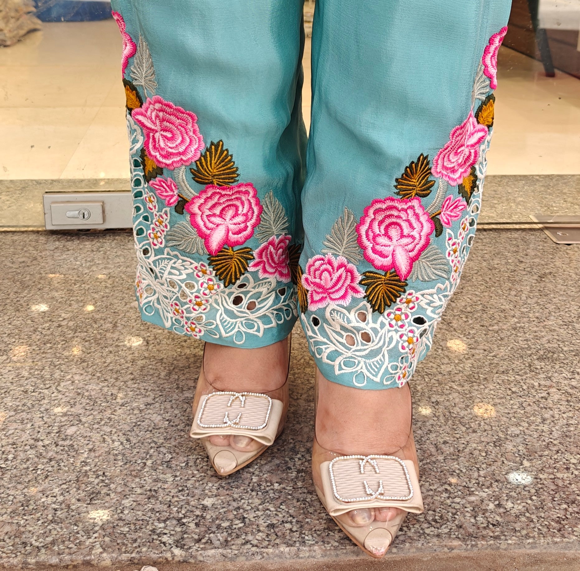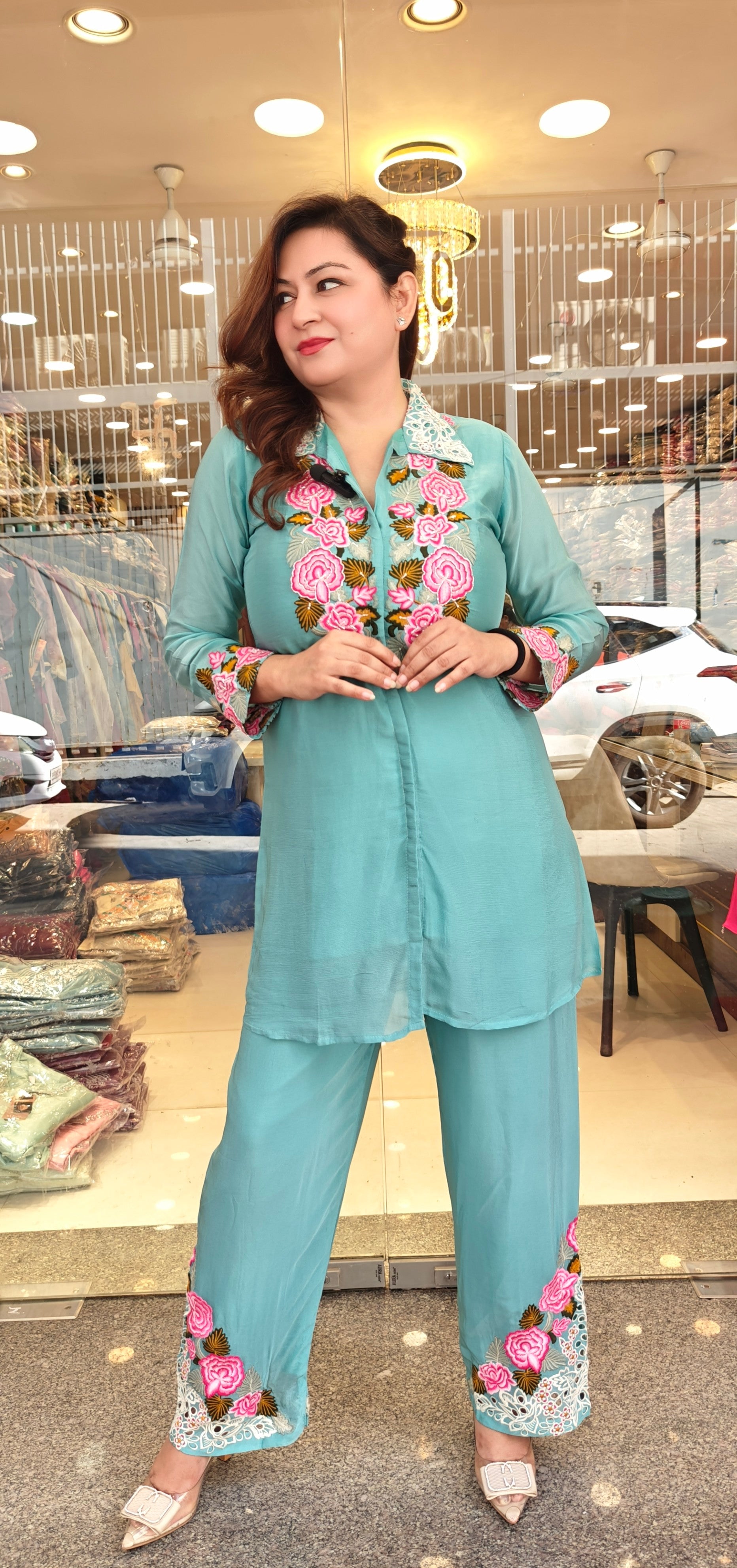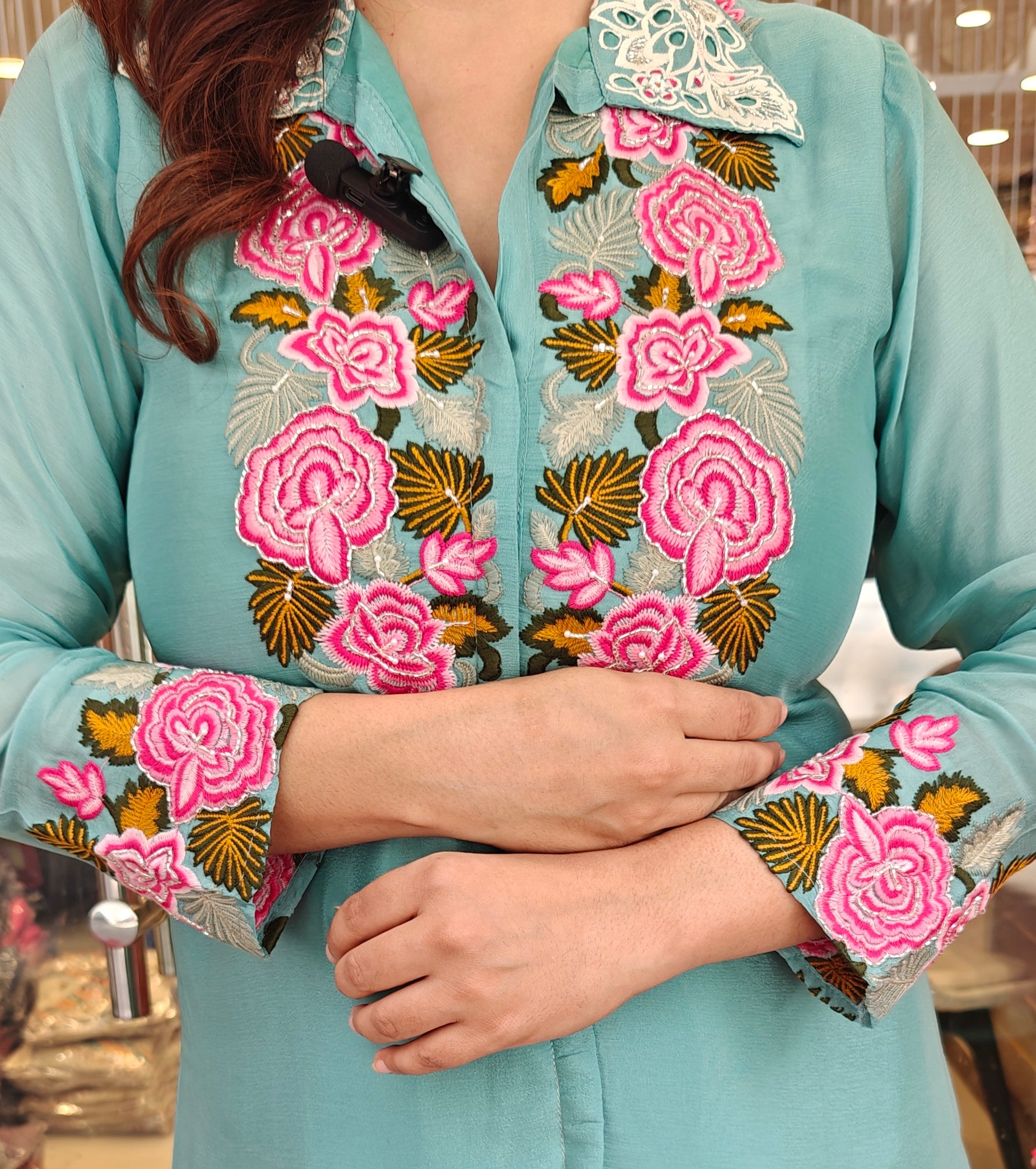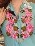 Step into effortless charm with our Aqua Rose Embroidered Coord Set. Crafted in a soothing aqua blue shade, this ensemble features delicate rose embroidery in vibrant pink and green hues, lending a refreshing floral touch. The straight-fit kurta with collared neckline is paired with matching trousers, detailed with embroidered blooms along the hem for a graceful finish. Perfect for brunches, festive gatherings, or elegant day wear.