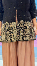 A statement fusion co-ord that blends bold elegance with festive glamour. This black short kurta features delicate gold embellishments and rich embroidered border detailing, perfectly paired with flowy camel-toned palazzo pants for a striking contrast look. Designed for women who love modern ethnic styling, this set is ideal for evening events, festive get-togethers, and occasion wear.
