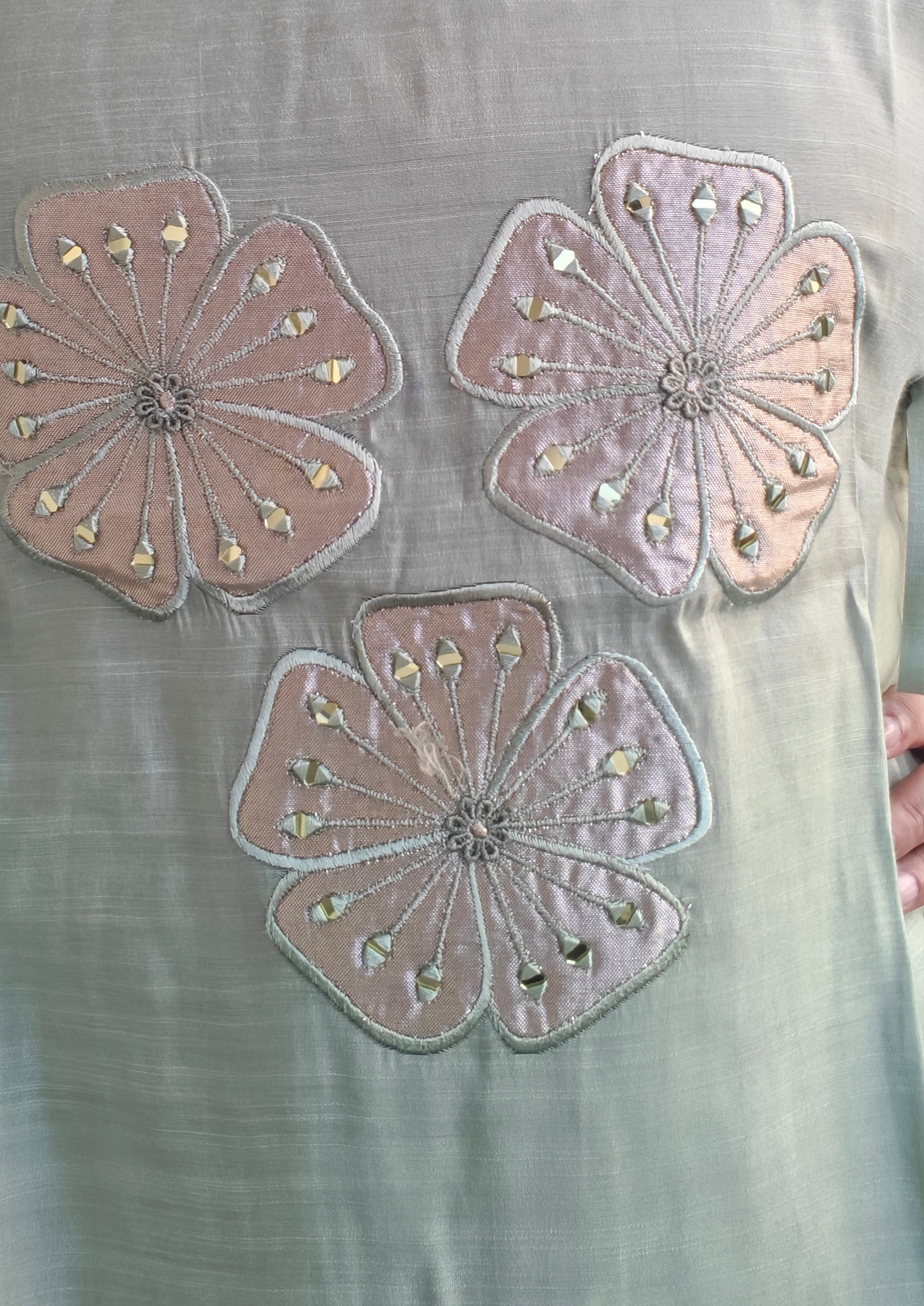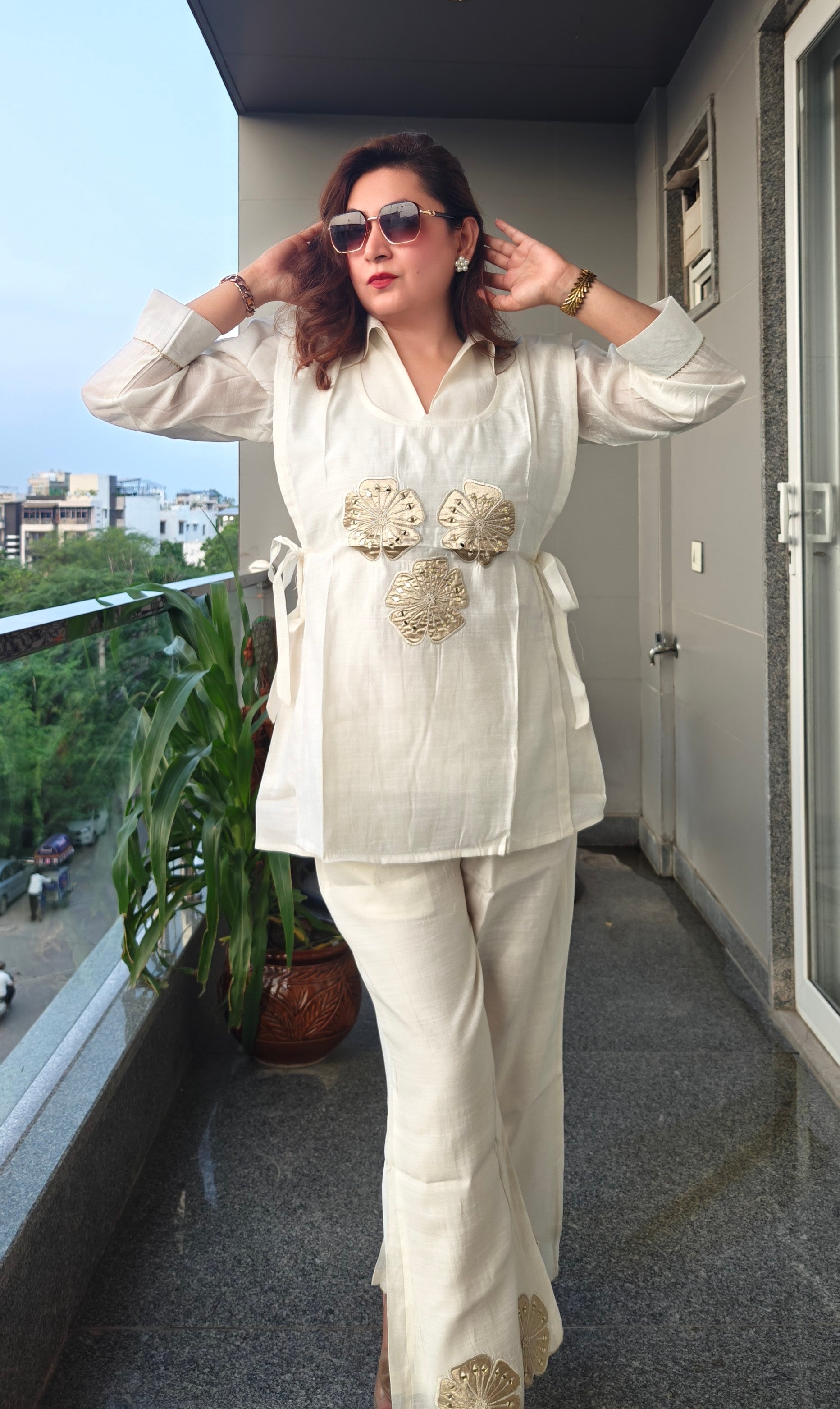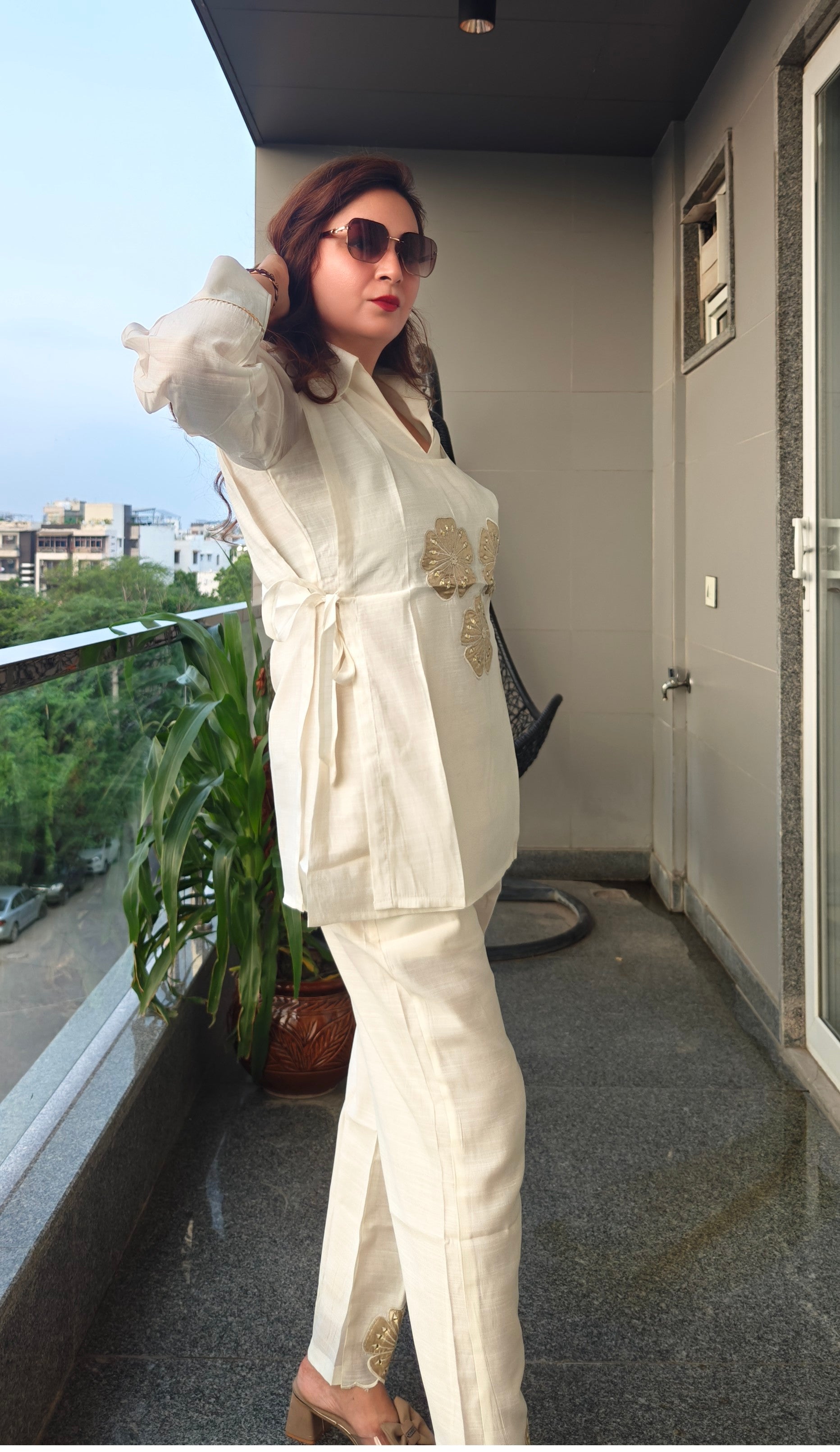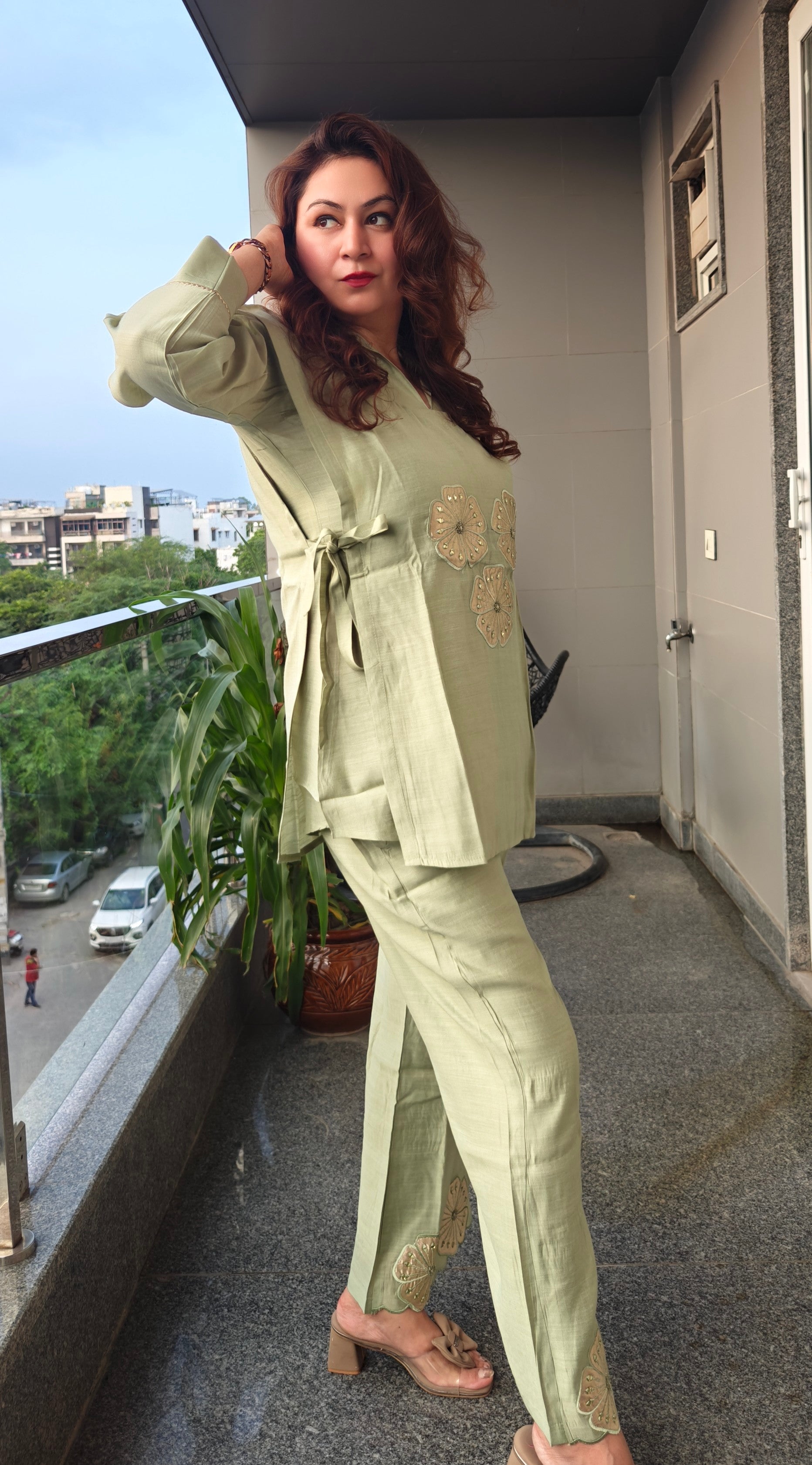 Soft elegance meets chic design in the Blush Bloom Coord Set. This 3-piece set features a pastel pink kurta with side tie detailing and intricate floral embroidery on the front, paired with tailored slit pants adorned with matching motifs. The lightweight dupatta completes the graceful look, making it perfect for daytime festivities or modern ethnic dressing.