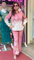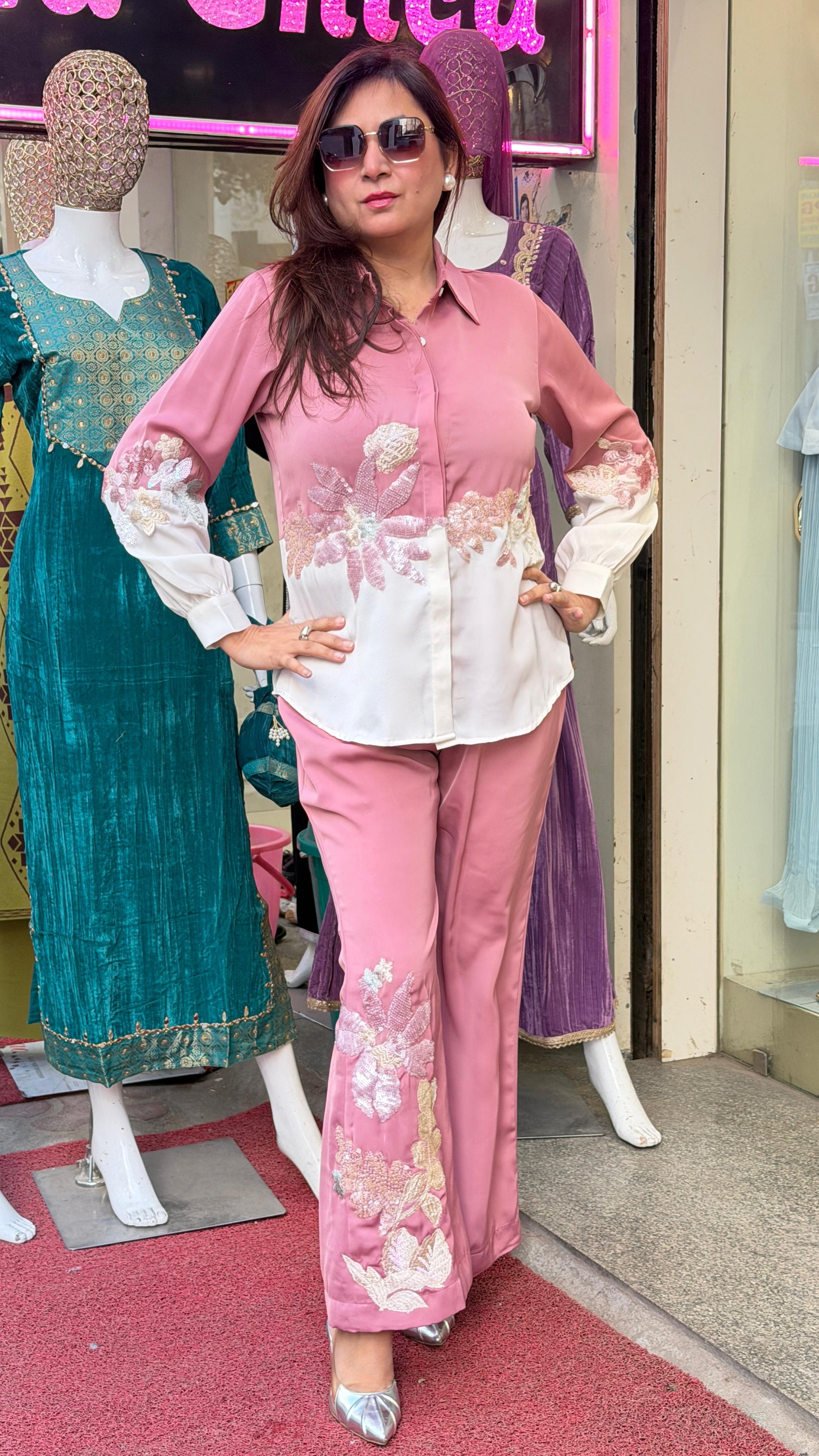 The Blush Bloom Embroidered Shirt & Pant Co-Ord Set is designed for women who love refined details and contemporary silhouettes.