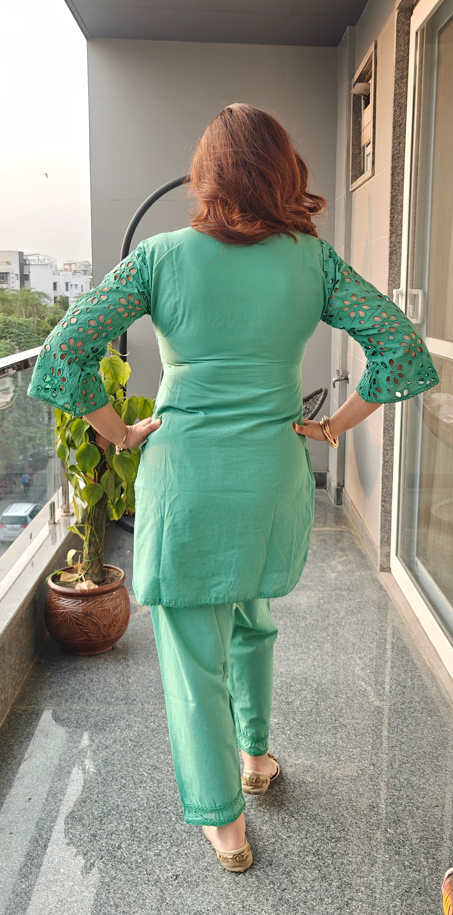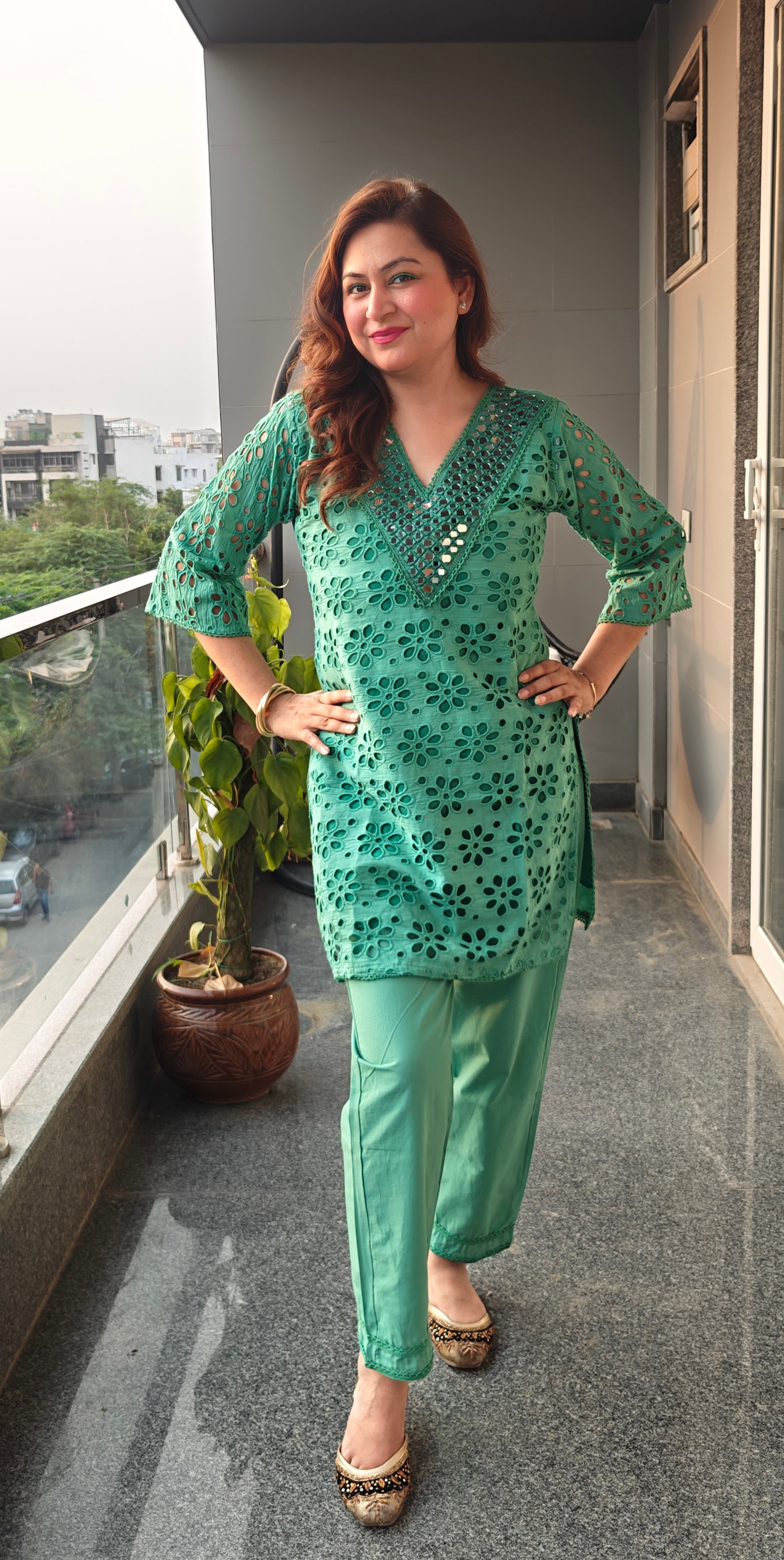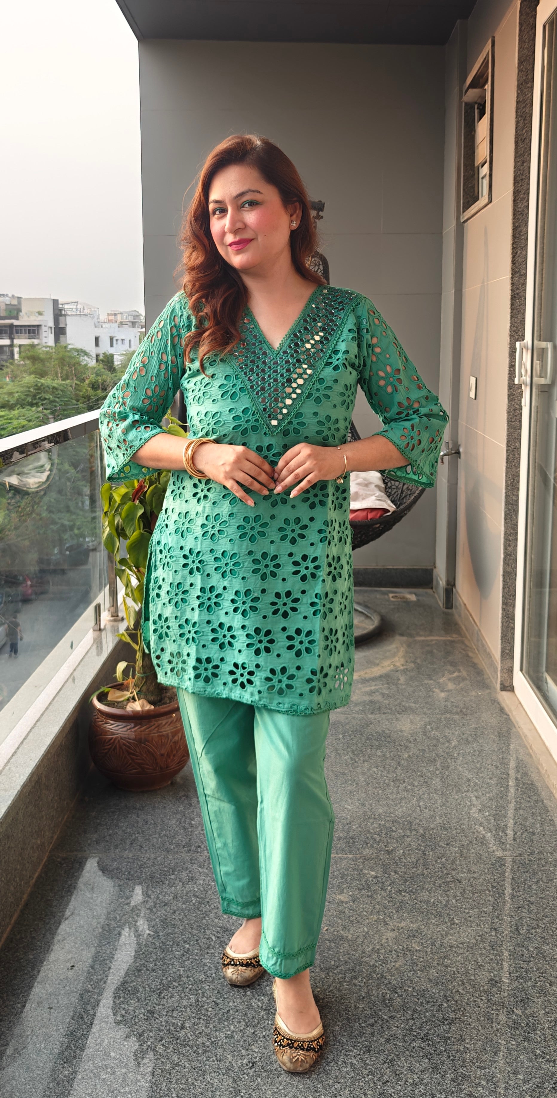 Top: V-neck kurta with floral cutwork and mirror hand detailing