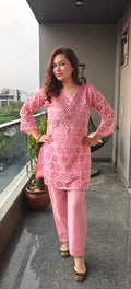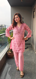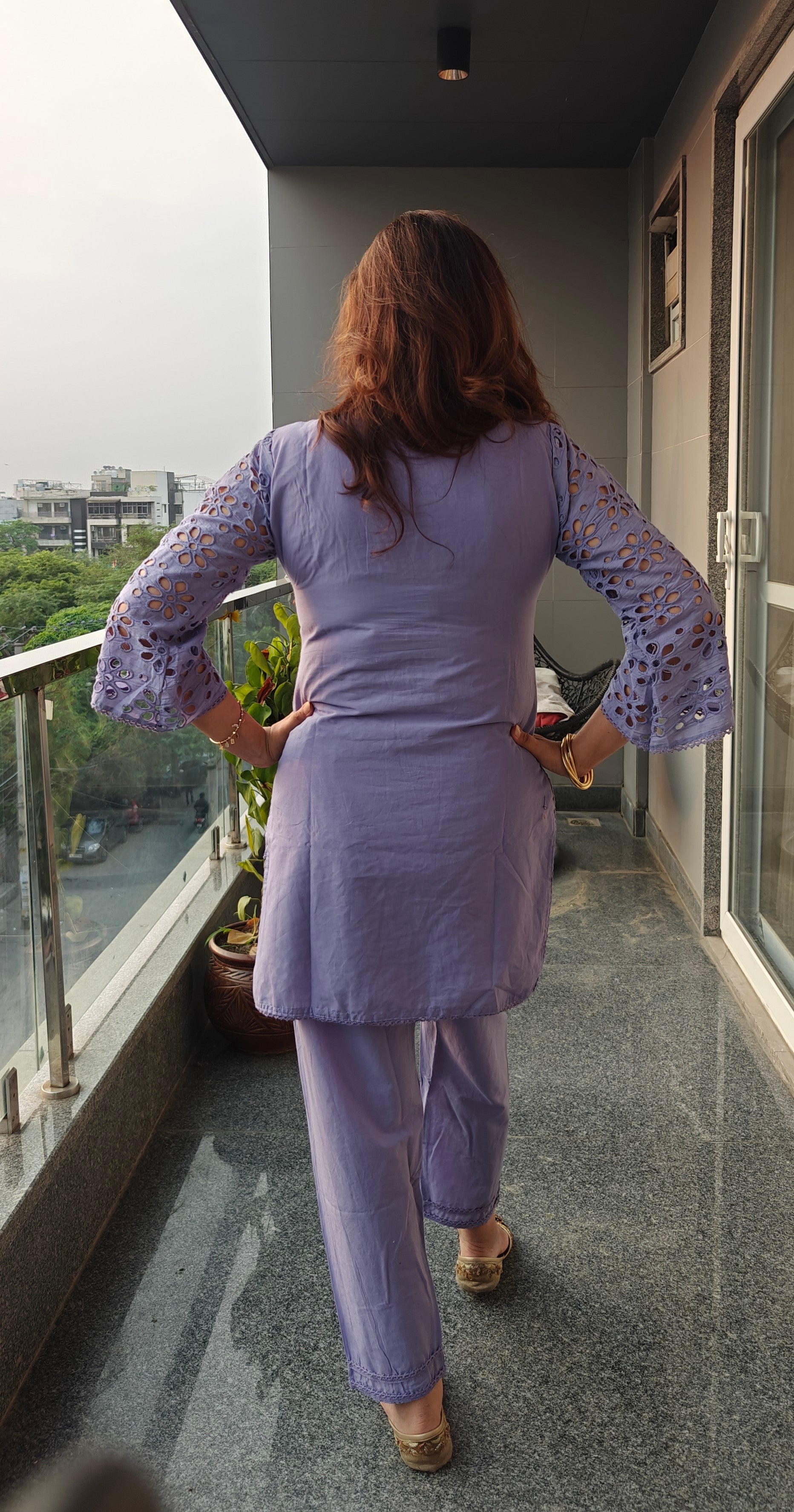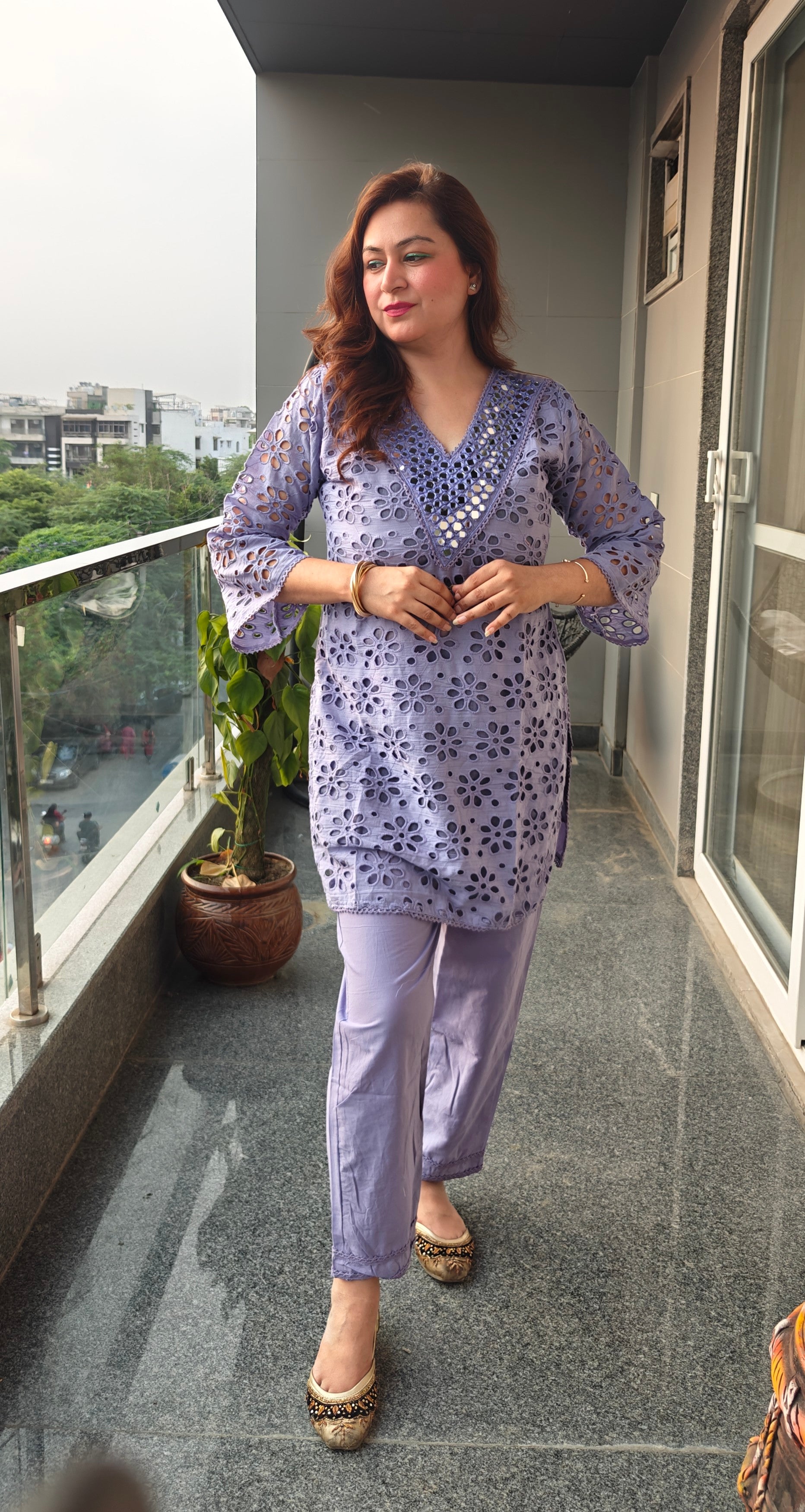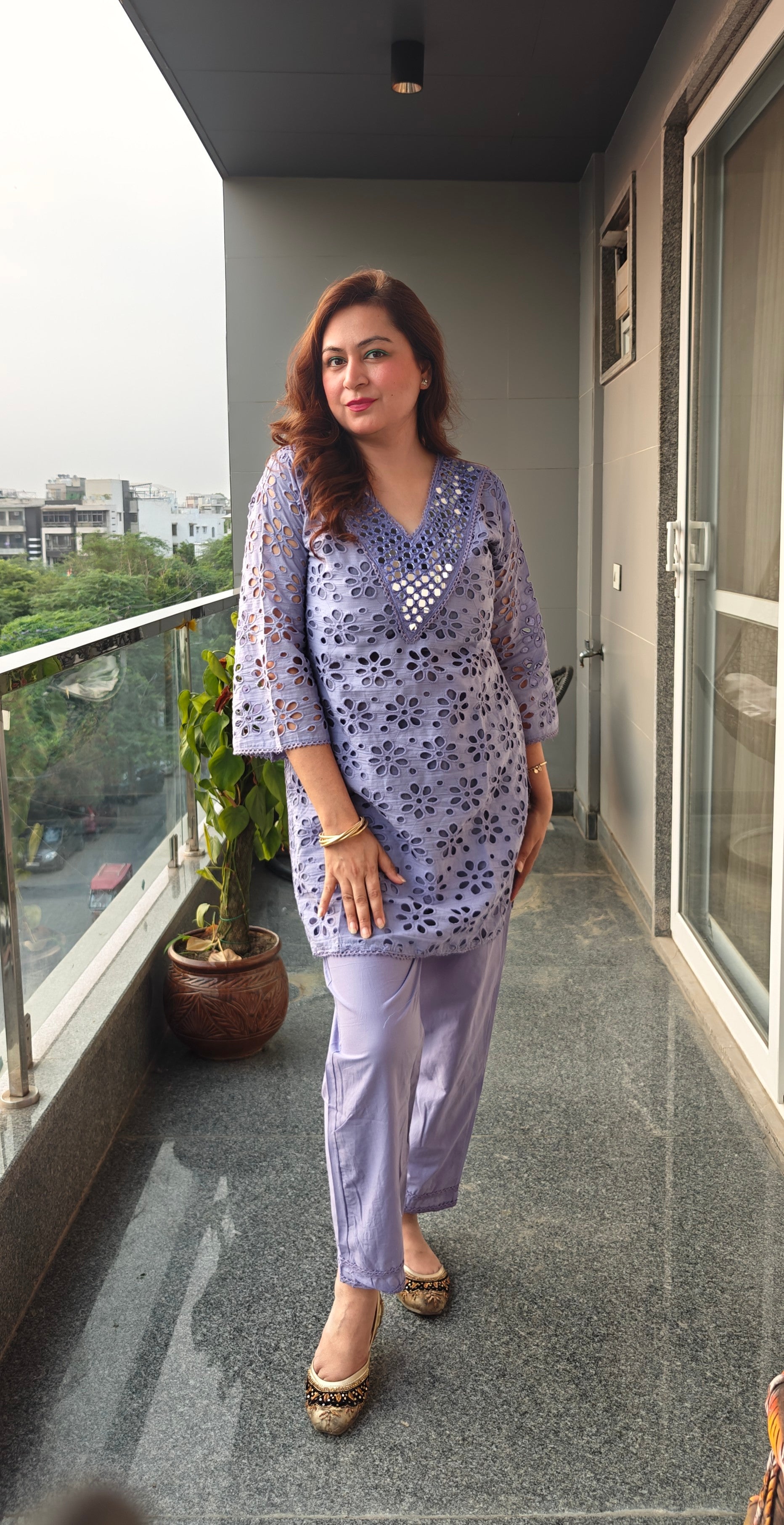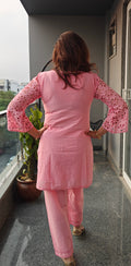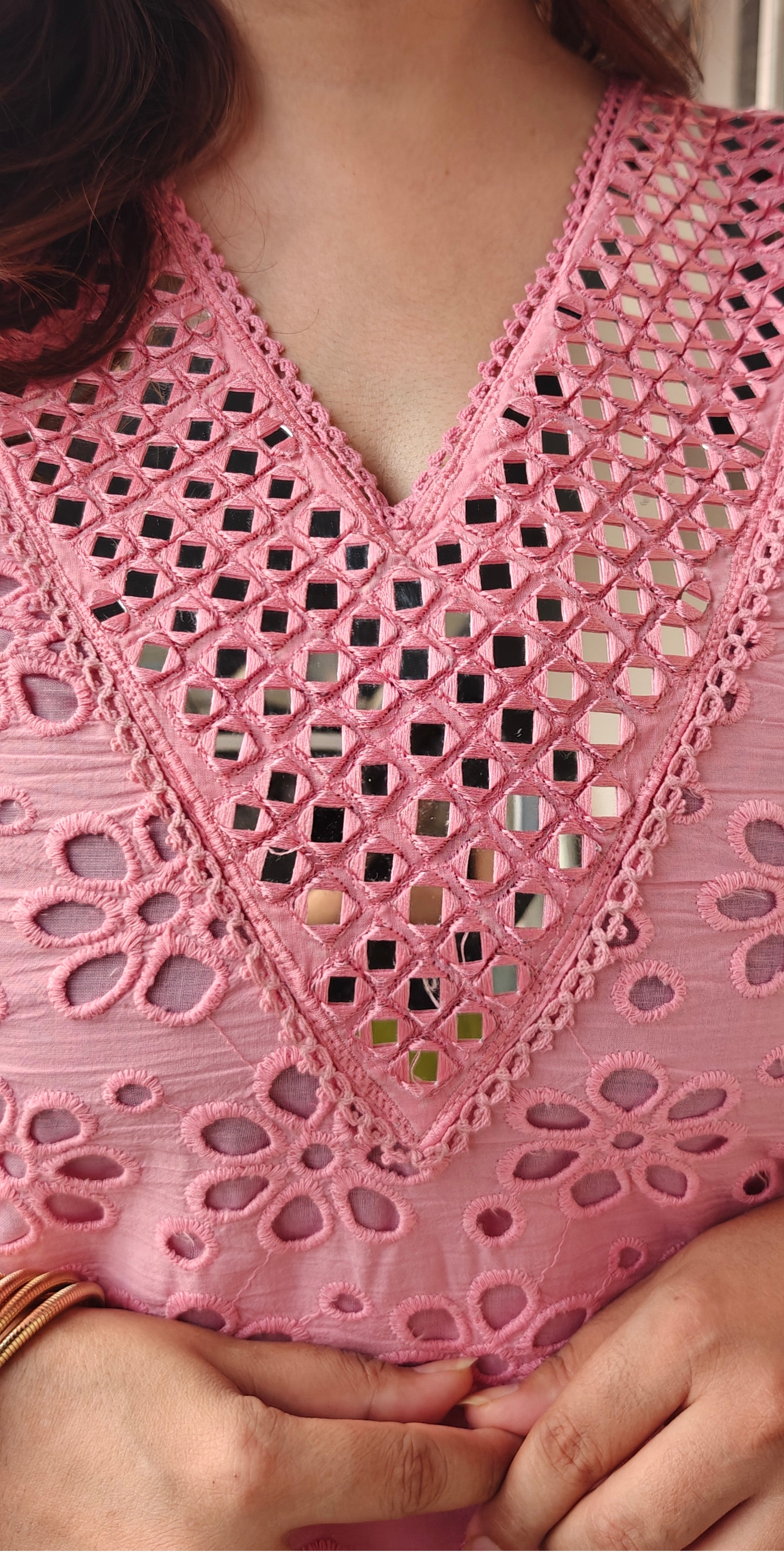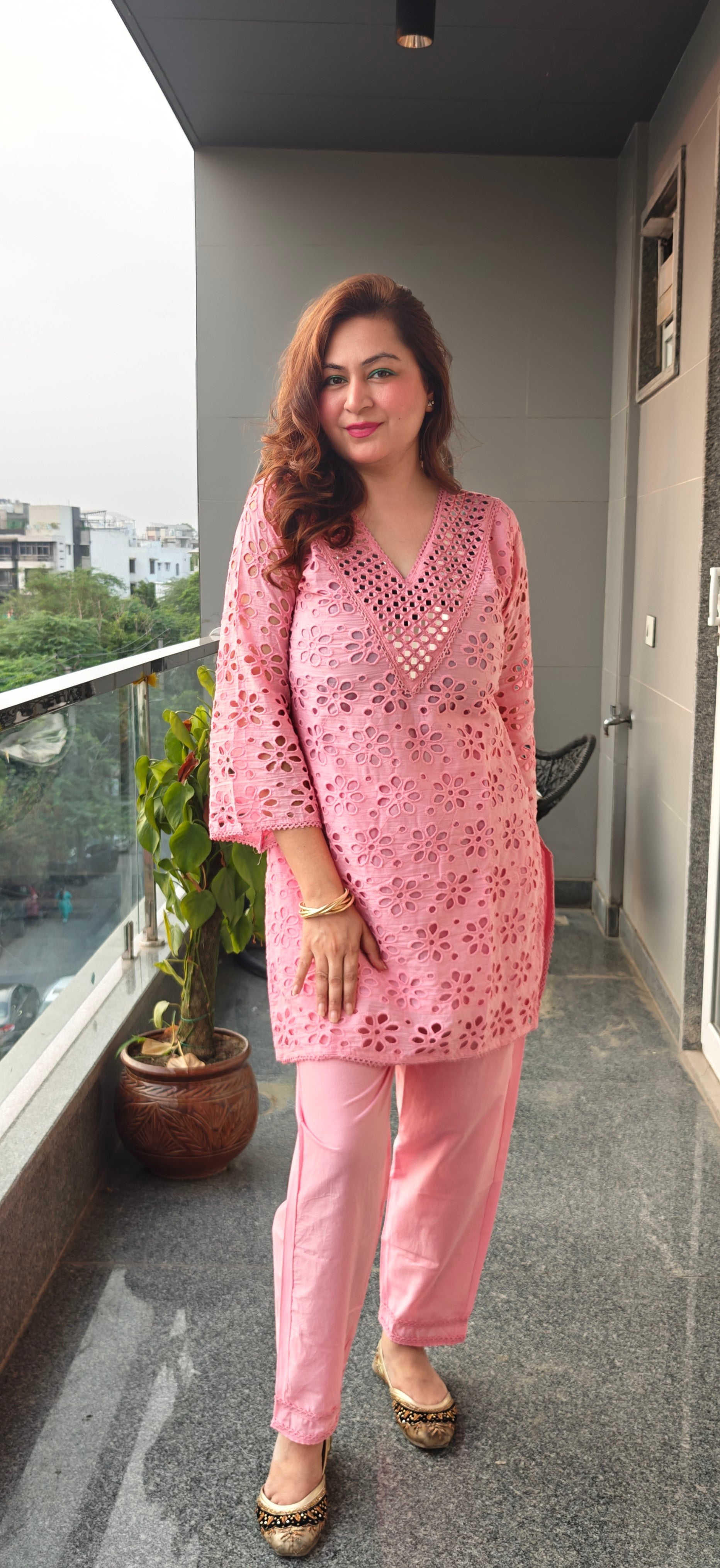 Channel effortless grace with our Blush Pink Shifli Coord Set, crafted in breathable cotton fabric with delicate all-over floral cutwork. The V-neck kurta features a beautifully embroidered neckline and scalloped sleeves, bringing a touch of elegance to this everyday essential.