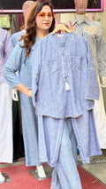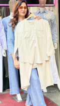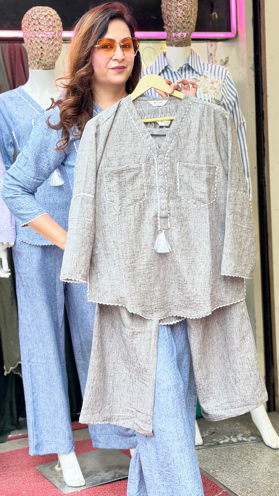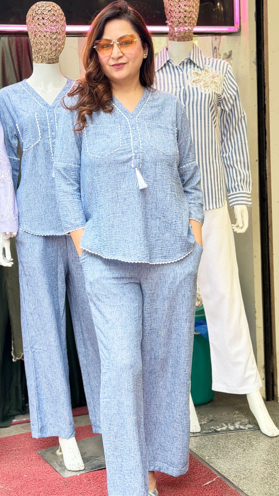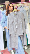 Stay effortlessly stylish with this relaxed-fit co-ord set, designed for all-day comfort and easy elegance. The top features a soft textured fabric with a V-neckline, button detailing, and subtle pocket accents for a laid-back yet refined look. Paired with wide-leg pants, this outfit offers a breezy silhouette perfect for casual outings, travel, or everyday wear. A versatile addition to your wardrobe that blends comfort with modern style.