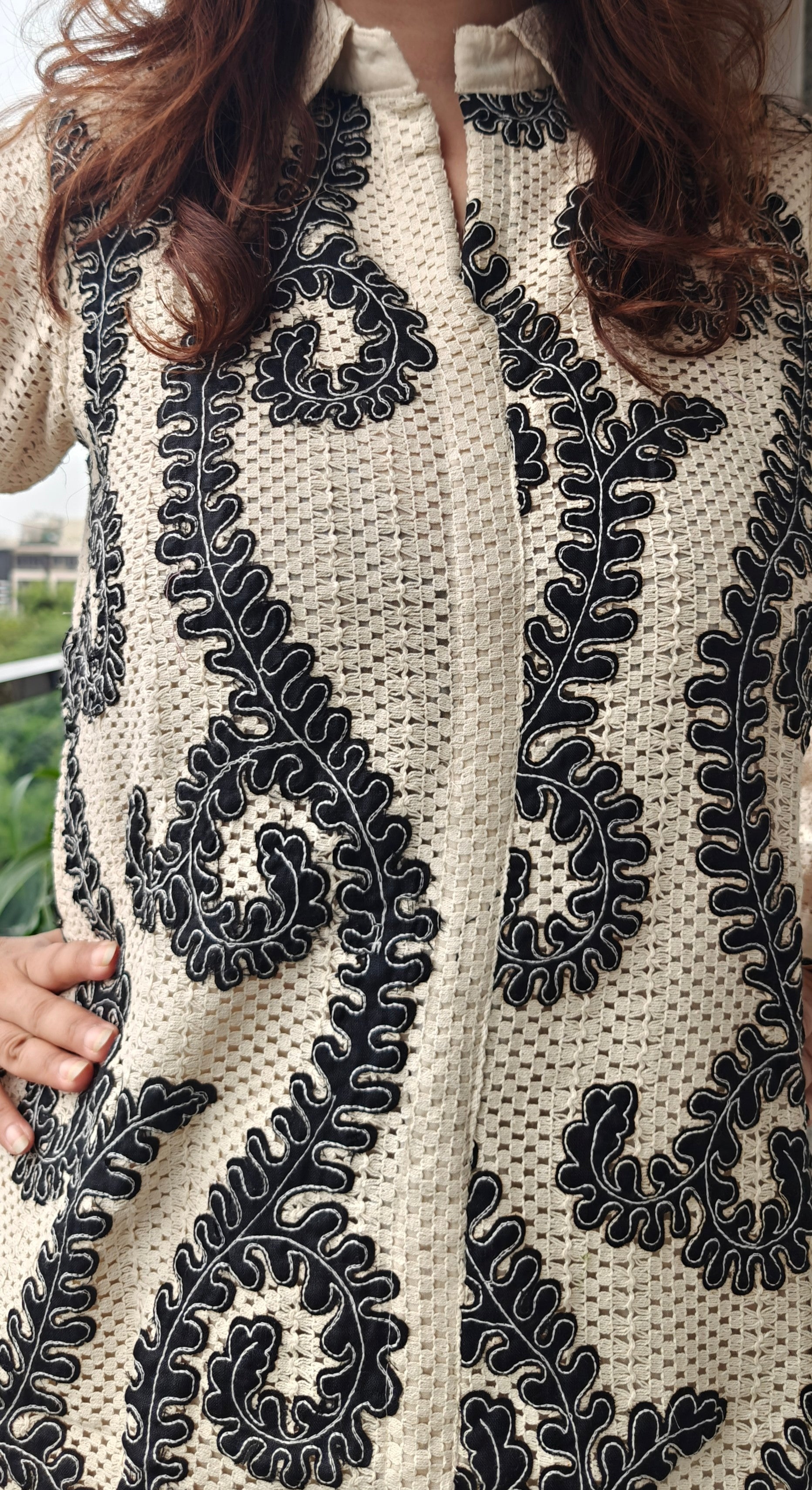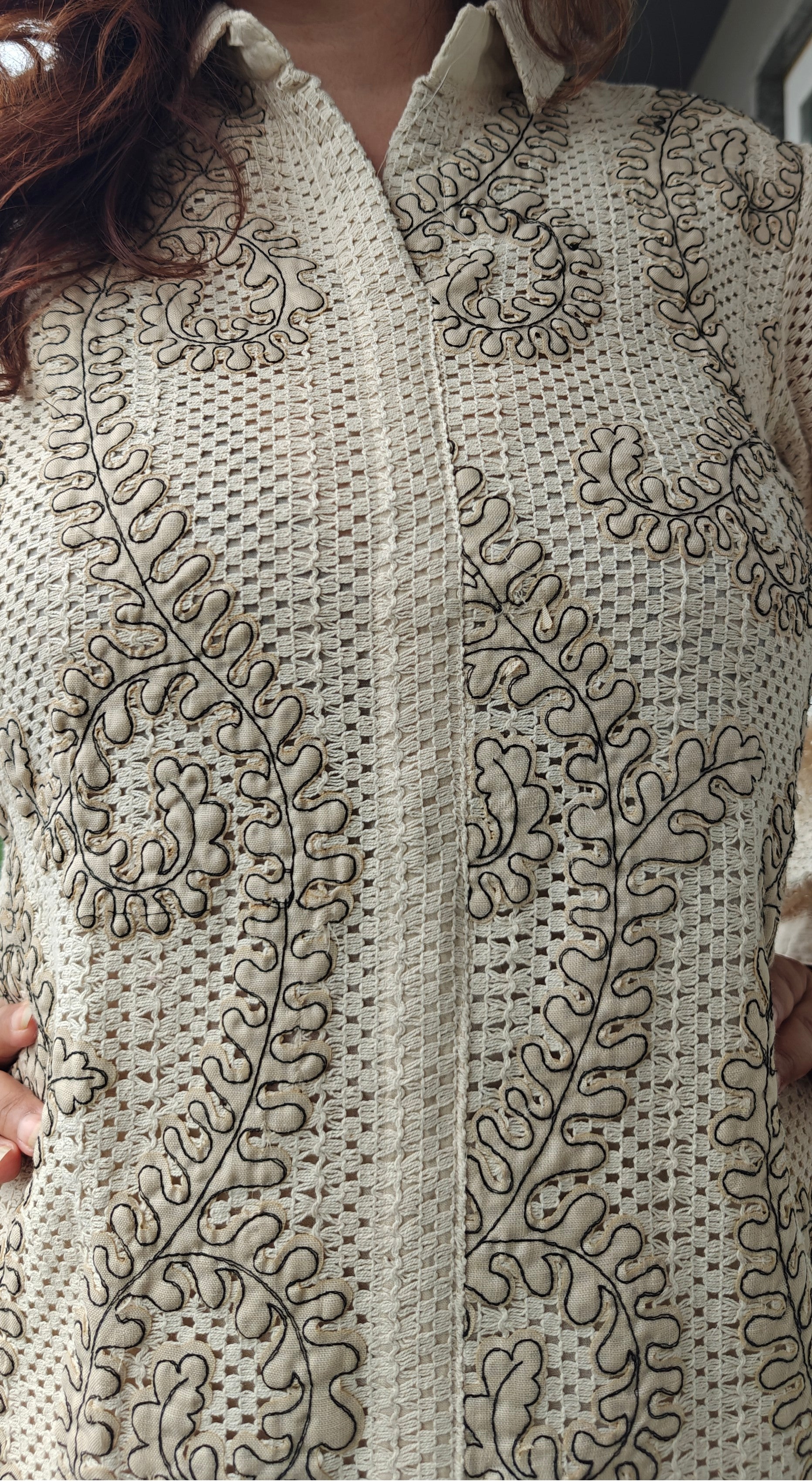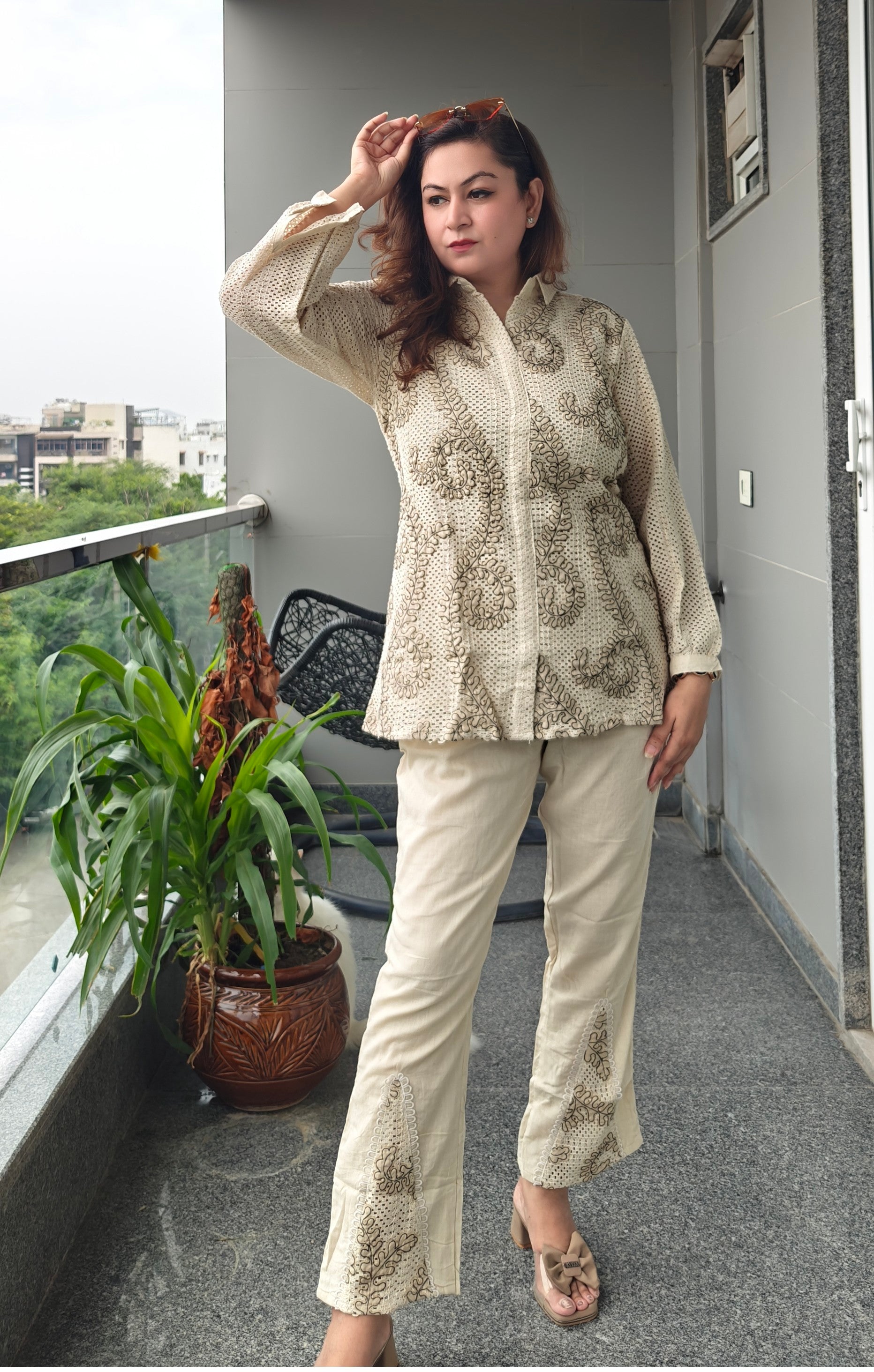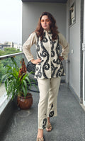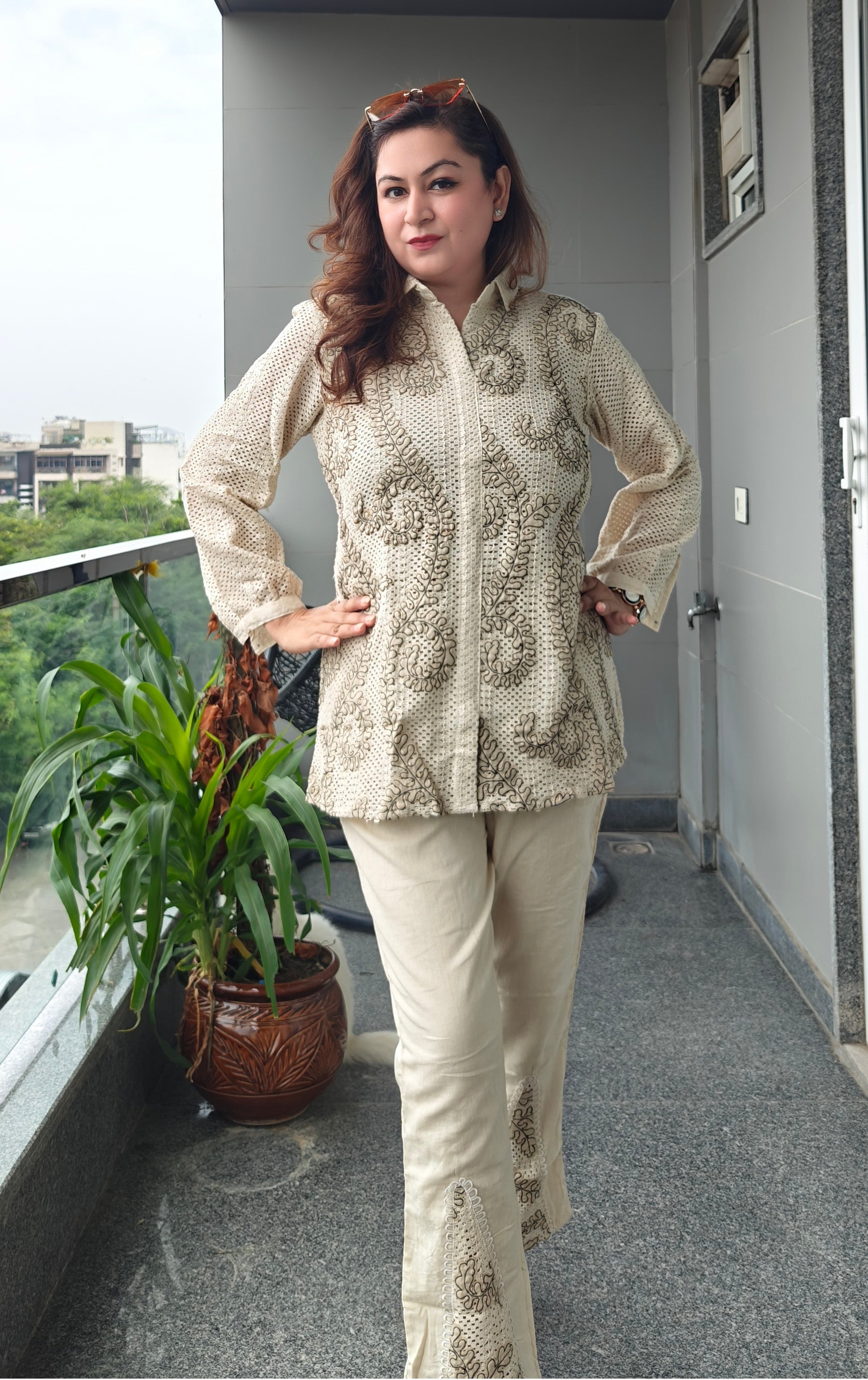 Elegance meets craftsmanship in our Croshiya Bloom Coord Set. Featuring intricate crochet embroidery on a collared button-down top paired with coordinated straight-fit pants, this set is designed for the woman who values grace with structure. The bold threadwork and delicate cutouts on the pants add a sophisticated twist—perfect for both casual brunches and chic evenings.