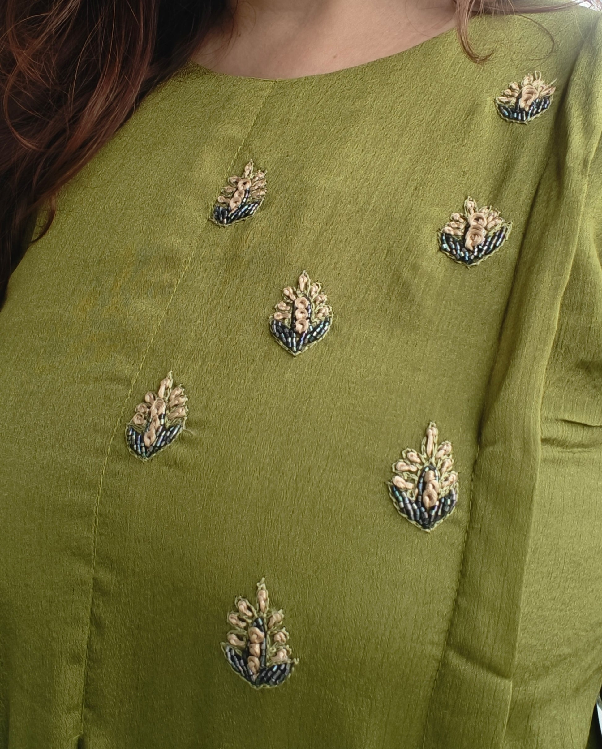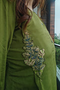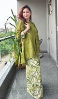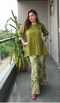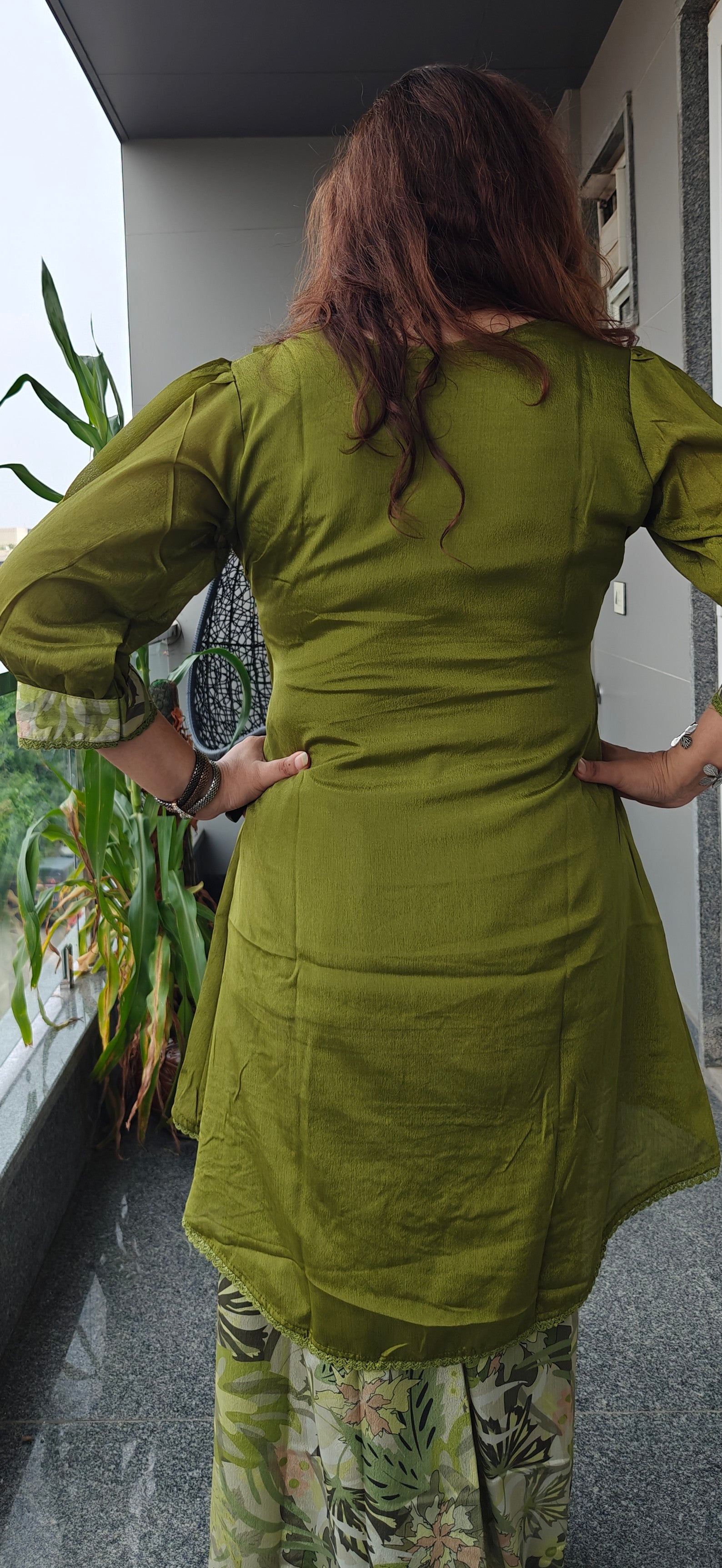 Effortlessly stylish, the Elegant Green Chinon Coord Set blends comfort with chic sophistication. The solid green chinon kurta features delicate floral hand embroidery with sequin accents, complemented by puffed sleeves with printed cuffs for a graceful touch. Paired with wide-leg printed pants in refreshing tropical tones, this coord set brings together modern flair and ethnic charm.