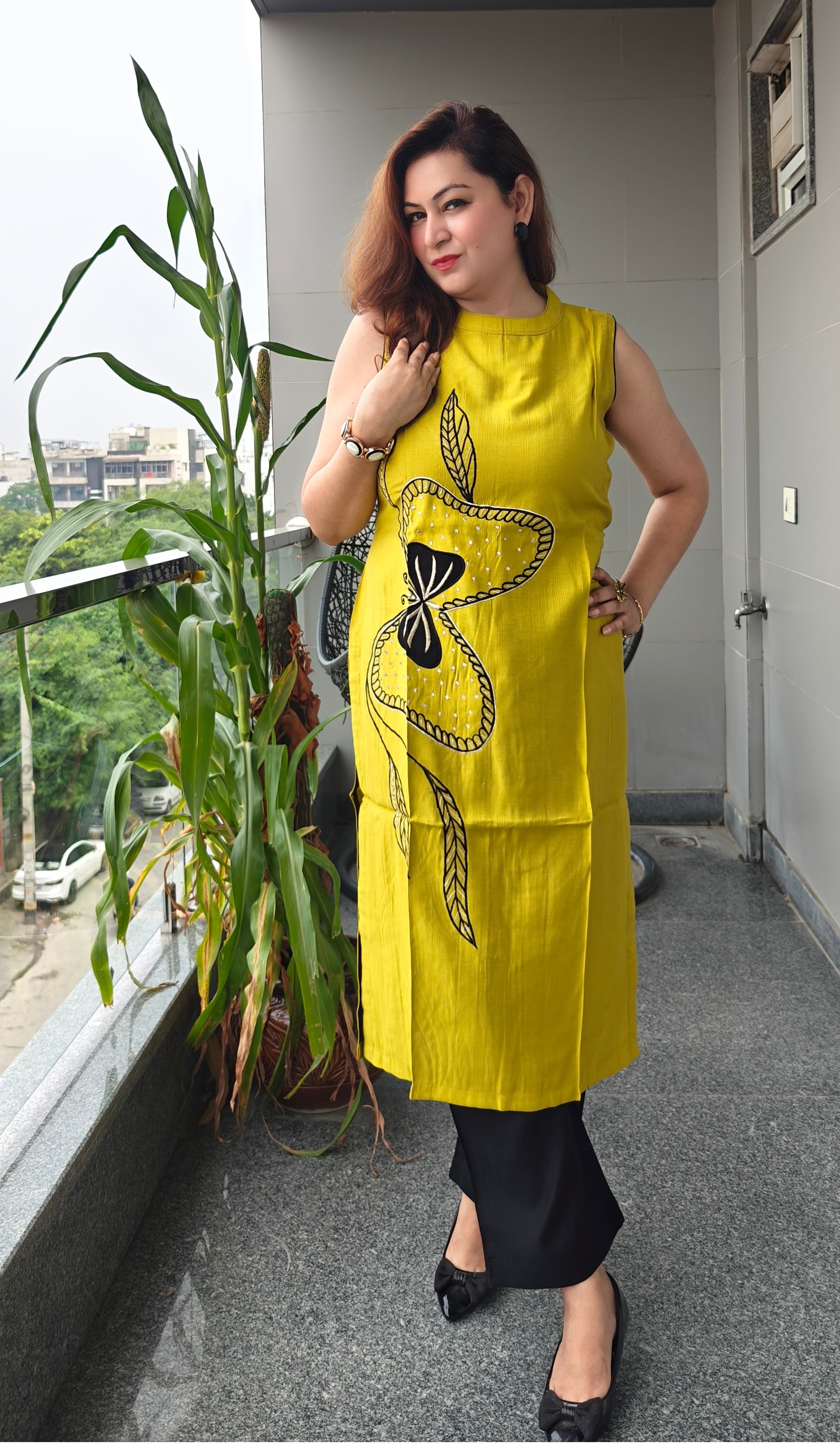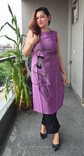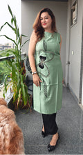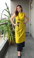 urn heads with this chic long coord set, crafted in breathable fabric for all-day comfort. The sleeveless straight kurta is adorned with bold black thread embroidery and bead accents, making it a statement piece. Paired with sleek black straight-fit trousers, this coord set brings together modern minimalism and ethnic charm—perfect for casual outings, brunches, or evening gatherings.