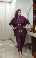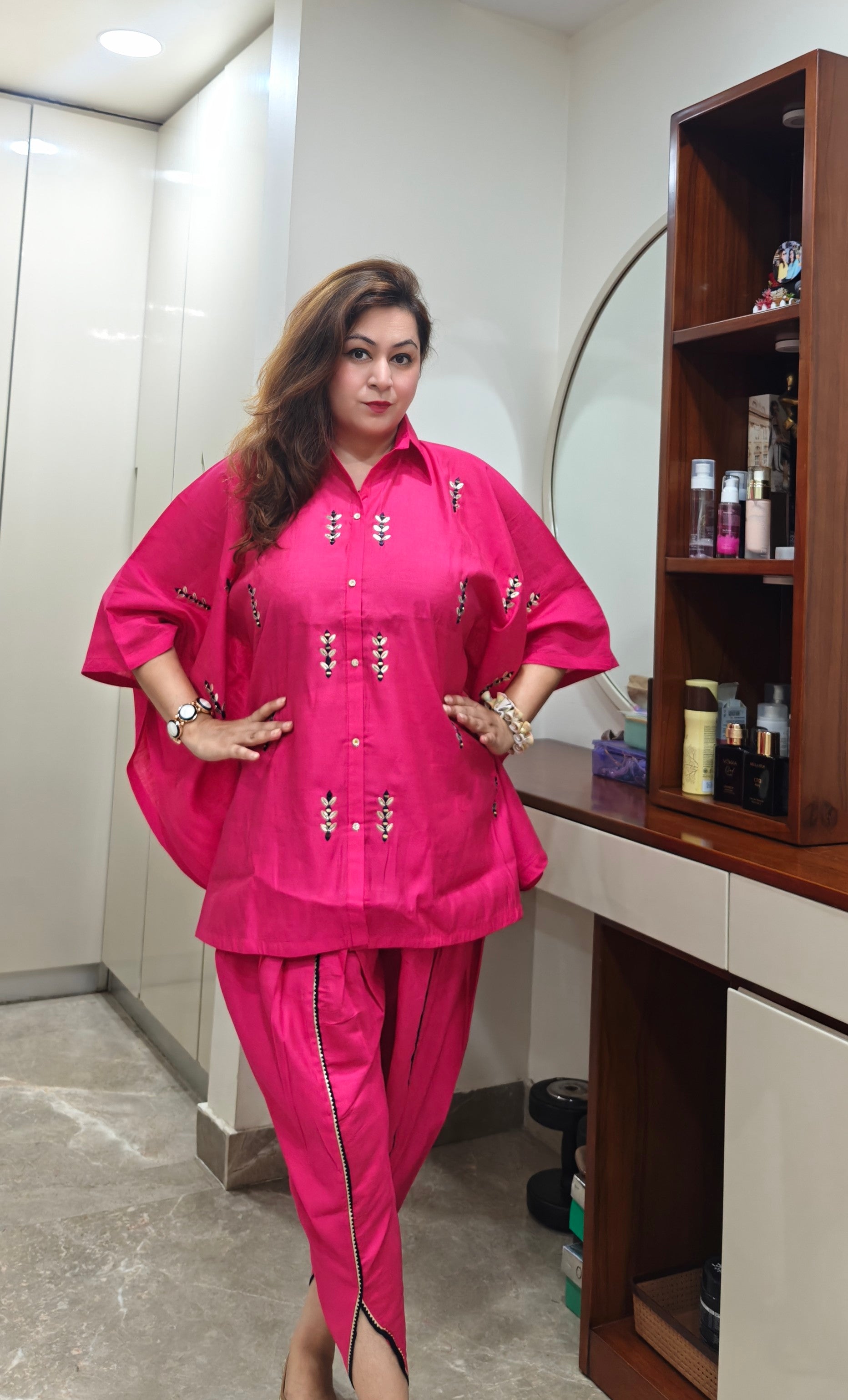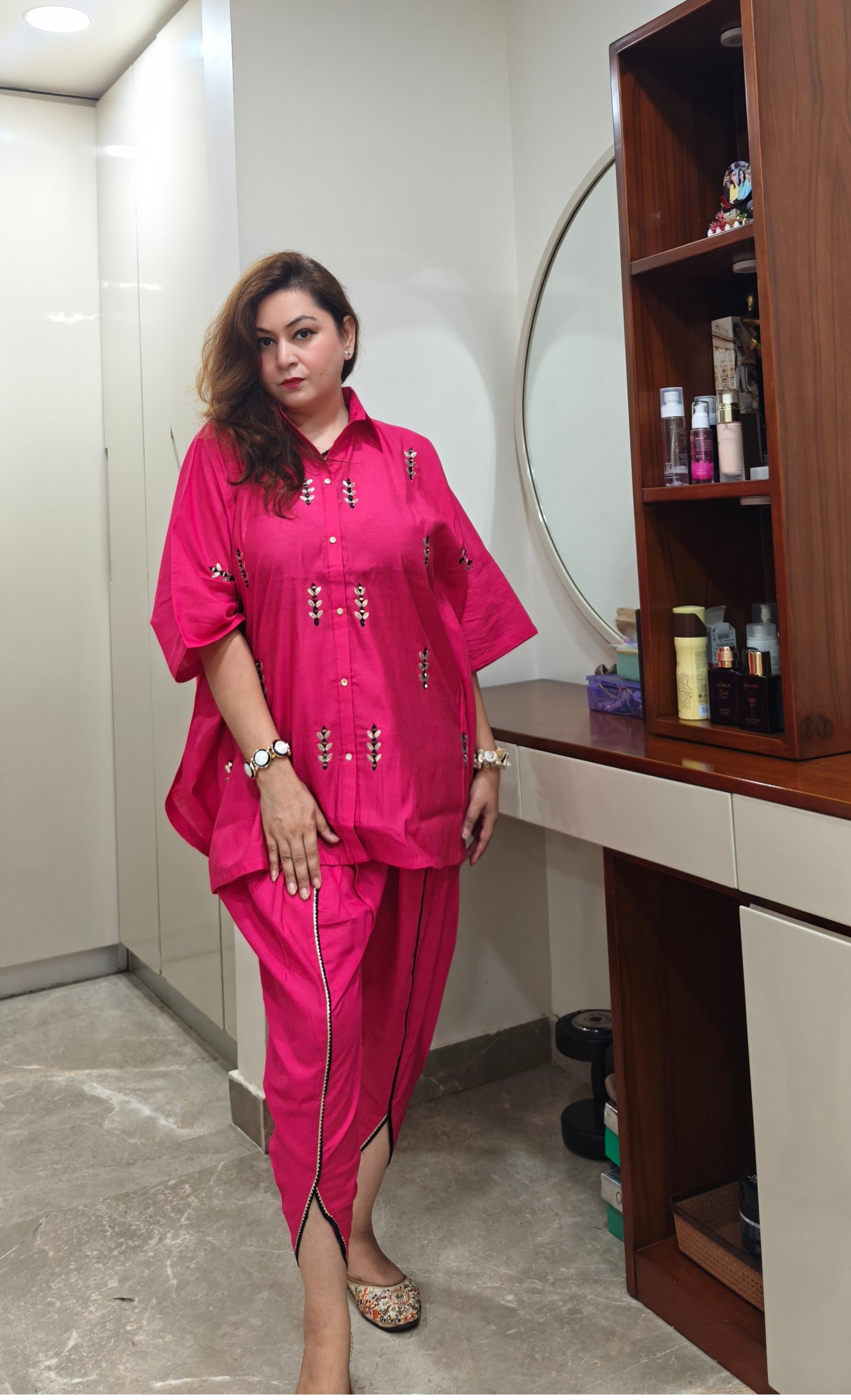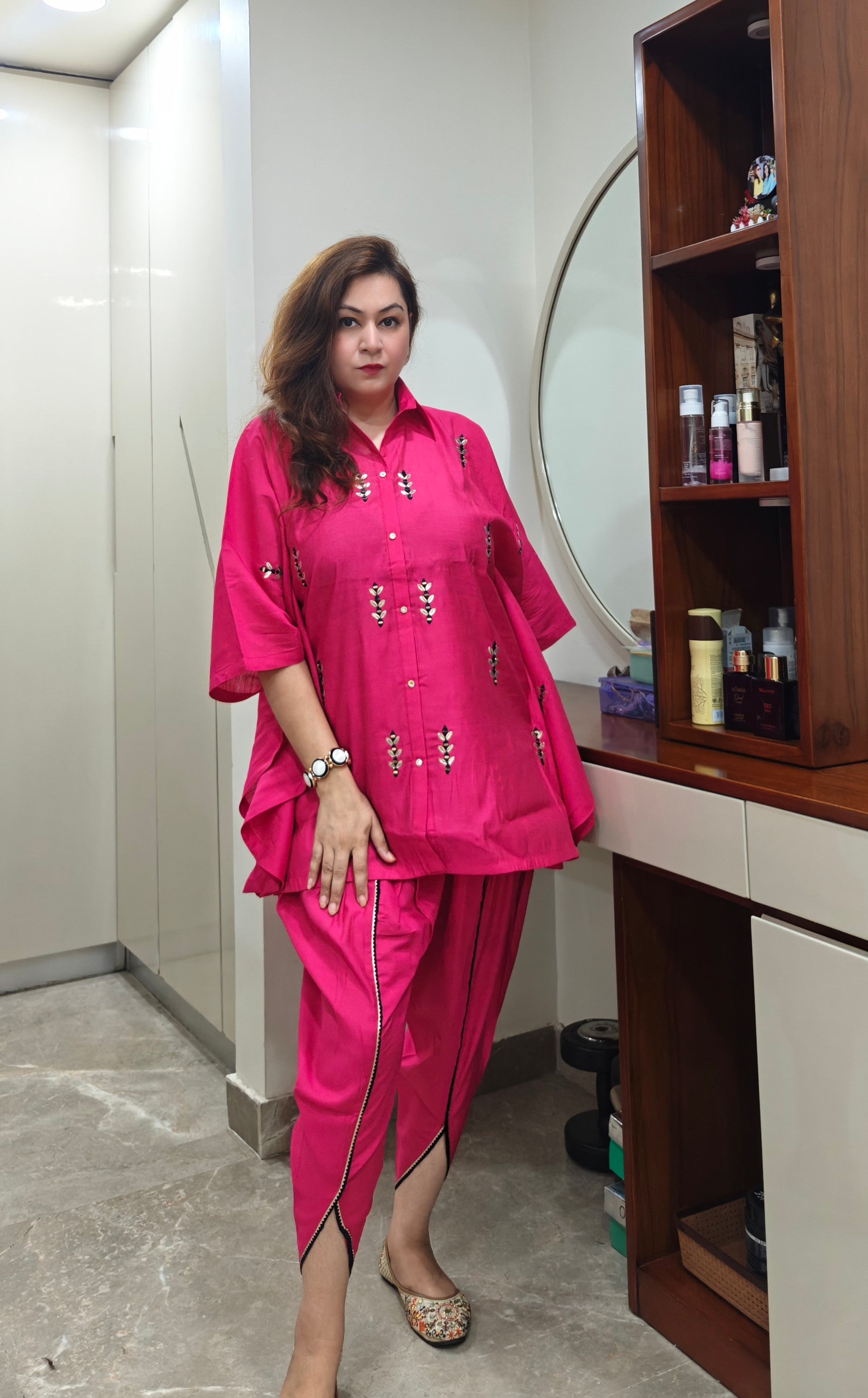 Unleash effortless glam with our Fuchsia Flow Short Kaftan Set – a vibrant fusion of comfort and charm. This breezy silhouette features a short kaftan-style top with mirror handwork and matching tulip pants that lend a flattering, modern desi vibe. Whether it’s a festive gathering or brunch with your girls, this set is made to make a bold, beautiful statement.