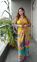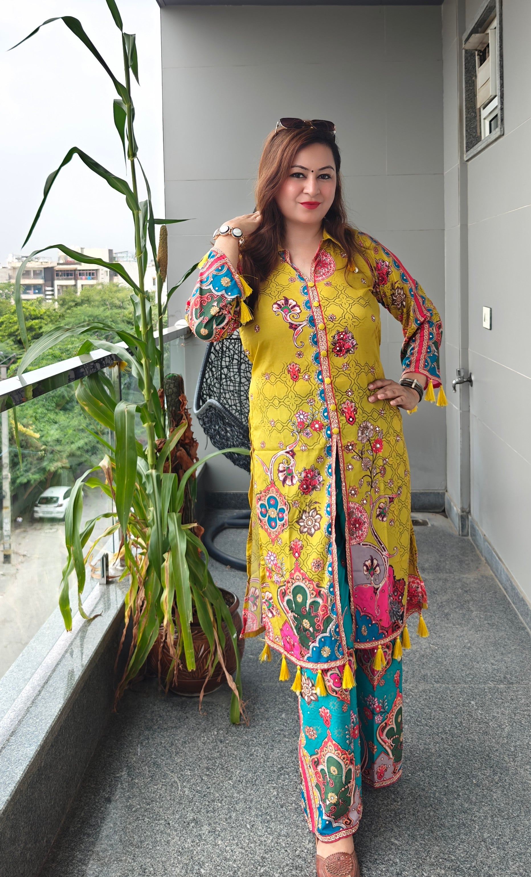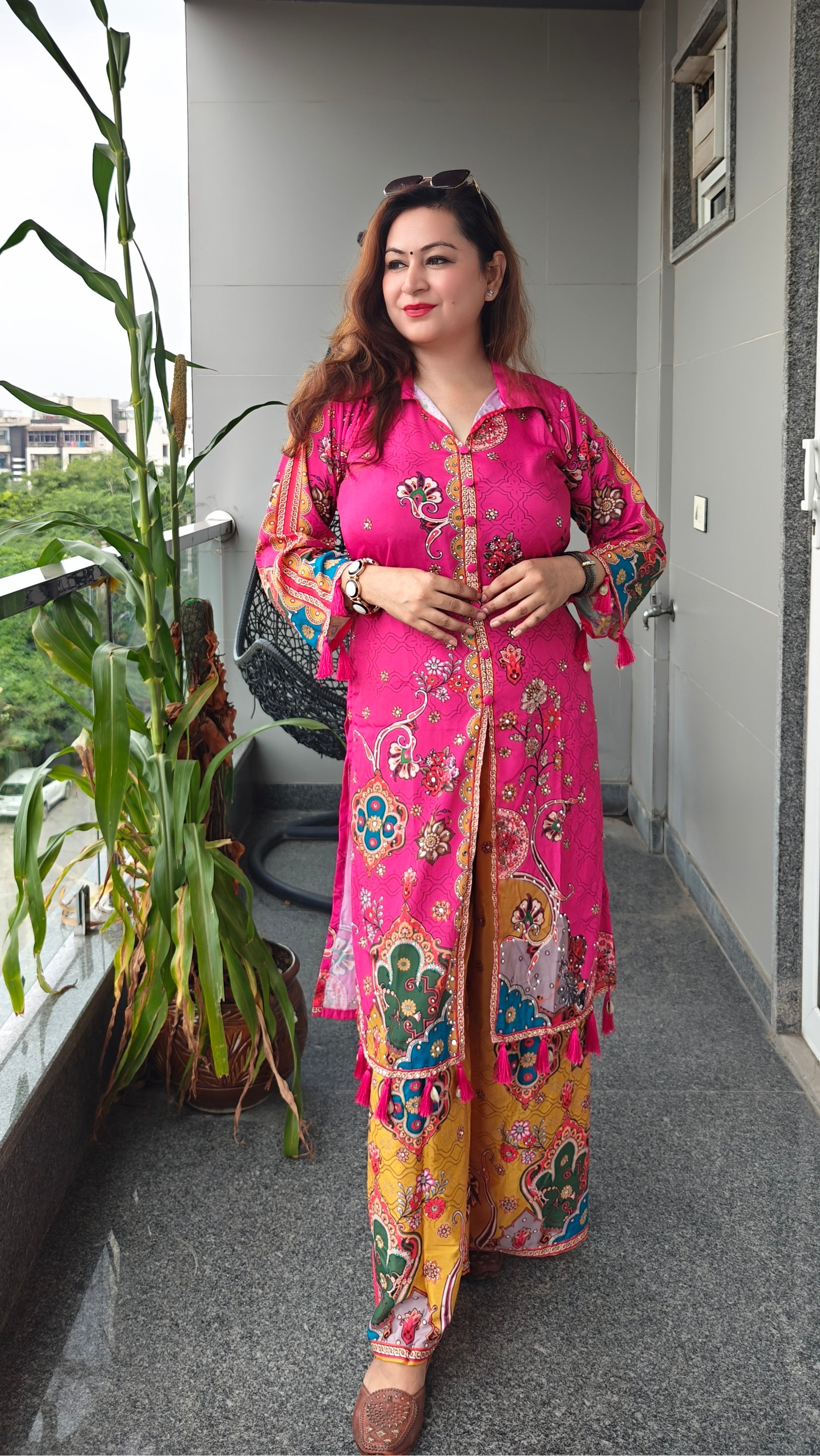 Bring a burst of color to your wardrobe with our Fuchsia Sunshine Semi Crepe Coord Set. Designed in vibrant shades of pink and mustard, this coord set features a statement button-down kurta adorned with eclectic floral and paisley prints. The tassel accents along the hem add a playful charm, while the wide-legged pants in contrasting hues elevate the look with a modern twist. Crafted in soft semi crepe fabric, it offers effortless drape and all-day comfort, making it perfect for festive gatherings, brunches, or casual chic outings.