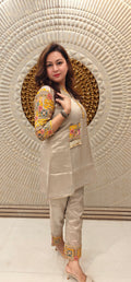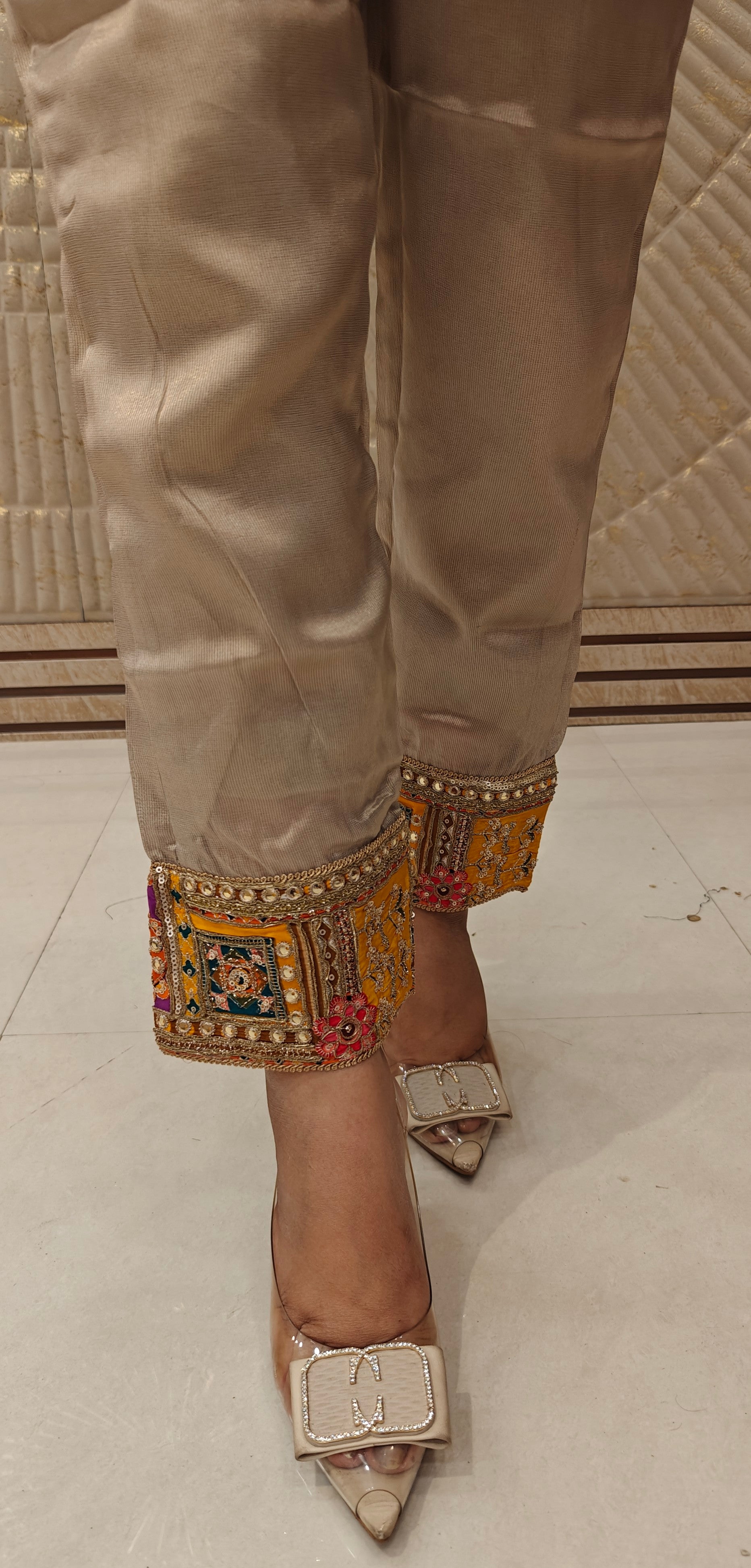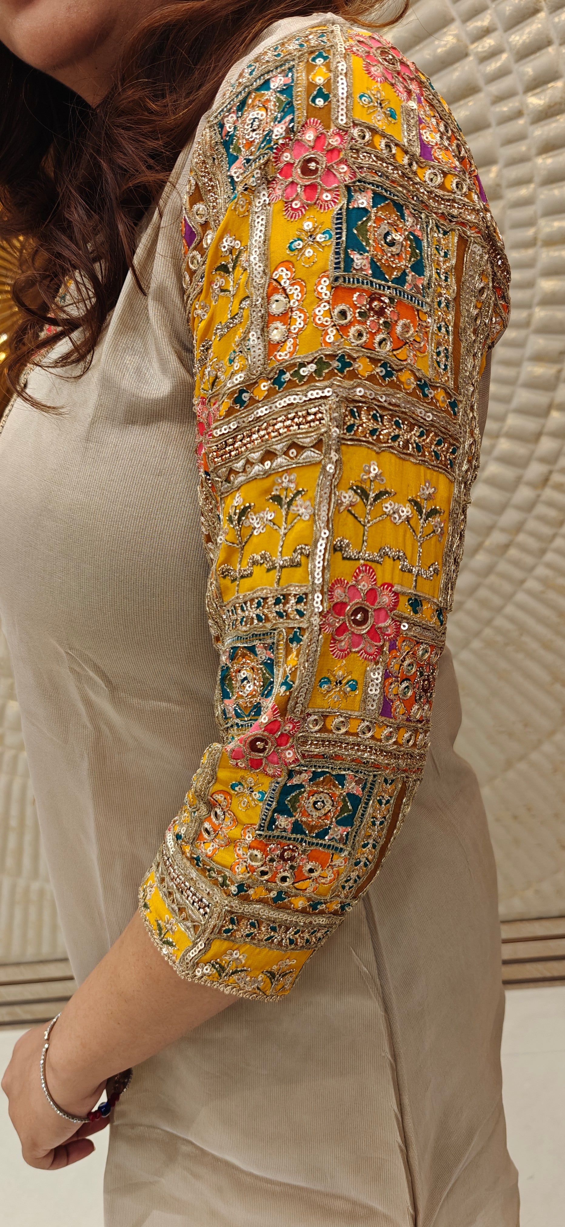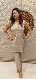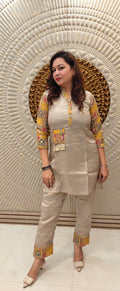 Step into the festive spirit with our Garba Coordset, designed to radiate joy and vibrance. Crafted from a luxurious silk-blend fabric, this elegant set features intricate mirror work and traditional embroidery on the sleeves, pants, and neckline. The bright mirror and thread embellishments reflect light beautifully, making it a perfect choice for Garba nights and festive celebrations. Paired with matching straight pants, the ensemble offers both style and comfort for energetic dance sessions or family gatherings.