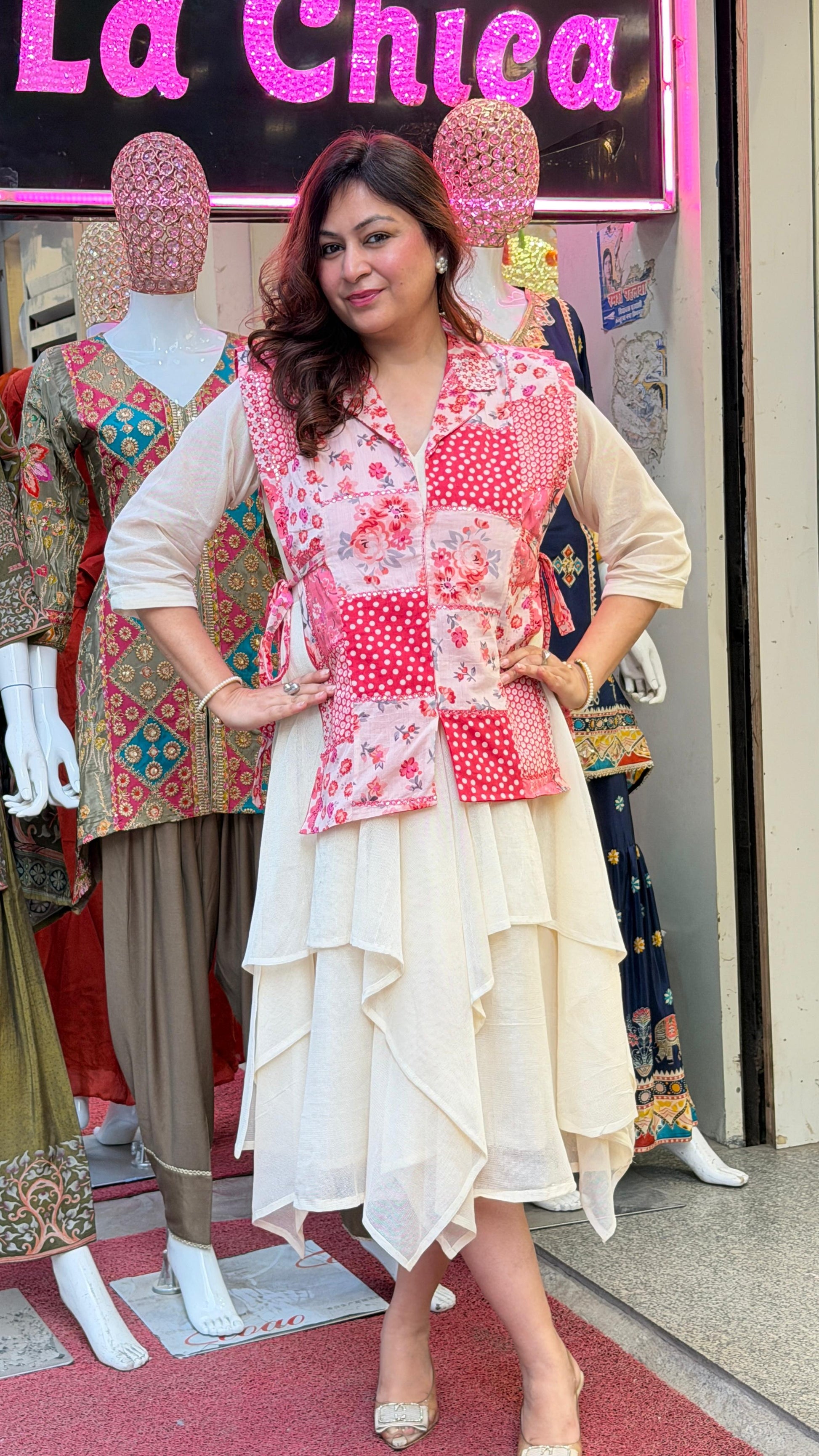 The ivory layered dress flows beautifully, offering movement and comfort, while the pink patchwork jacket—crafted with mixed floral and polka prints—adds a cheerful, statement touch. Designed for relaxed elegance, this outfit is perfect for brunches, festive afternoons, vacations, and intimate celebrations.