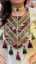 Elevate your ethnic wardrobe with this elegant Ivory Kurta Set, crafted for timeless festive charm. The kurta features rich multicolour embroidery in a V-panel design, beautifully enhanced with handcrafted tassel detailing that adds movement and character to the look.