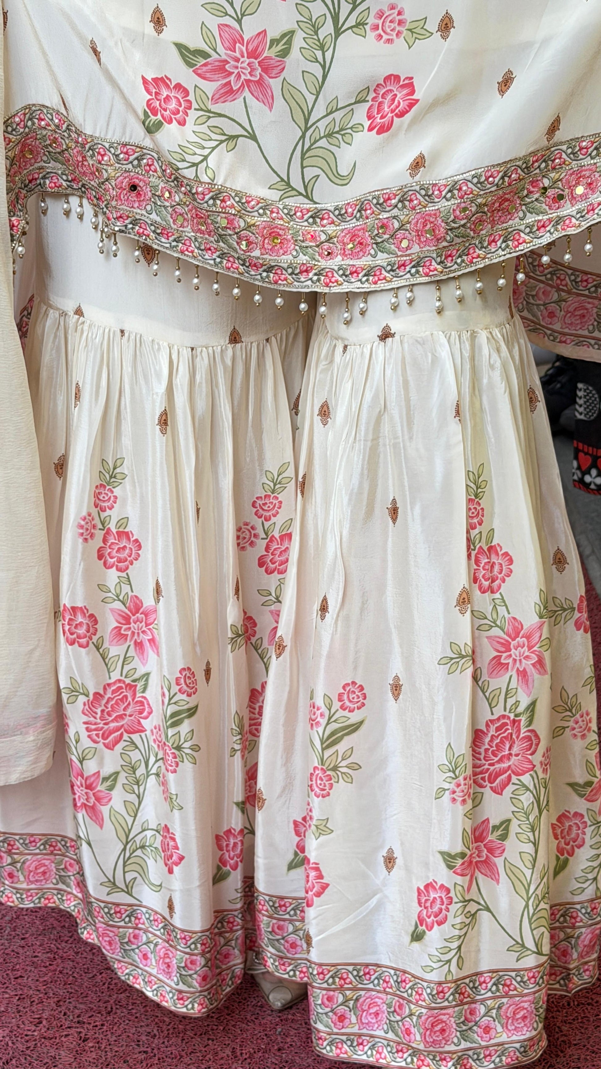 Step into graceful elegance with this ivory floral kurta sharara set, designed to bring soft festive charm and feminine sophistication to your wardrobe. Featuring delicate pink floral prints with detailed embroidery on the neckline and borders, this set blends traditional artistry with a fresh, modern feel. The flowy sharara and lightweight dupatta complete the look, making it perfect for festive gatherings, brunch events, and day celebrations.