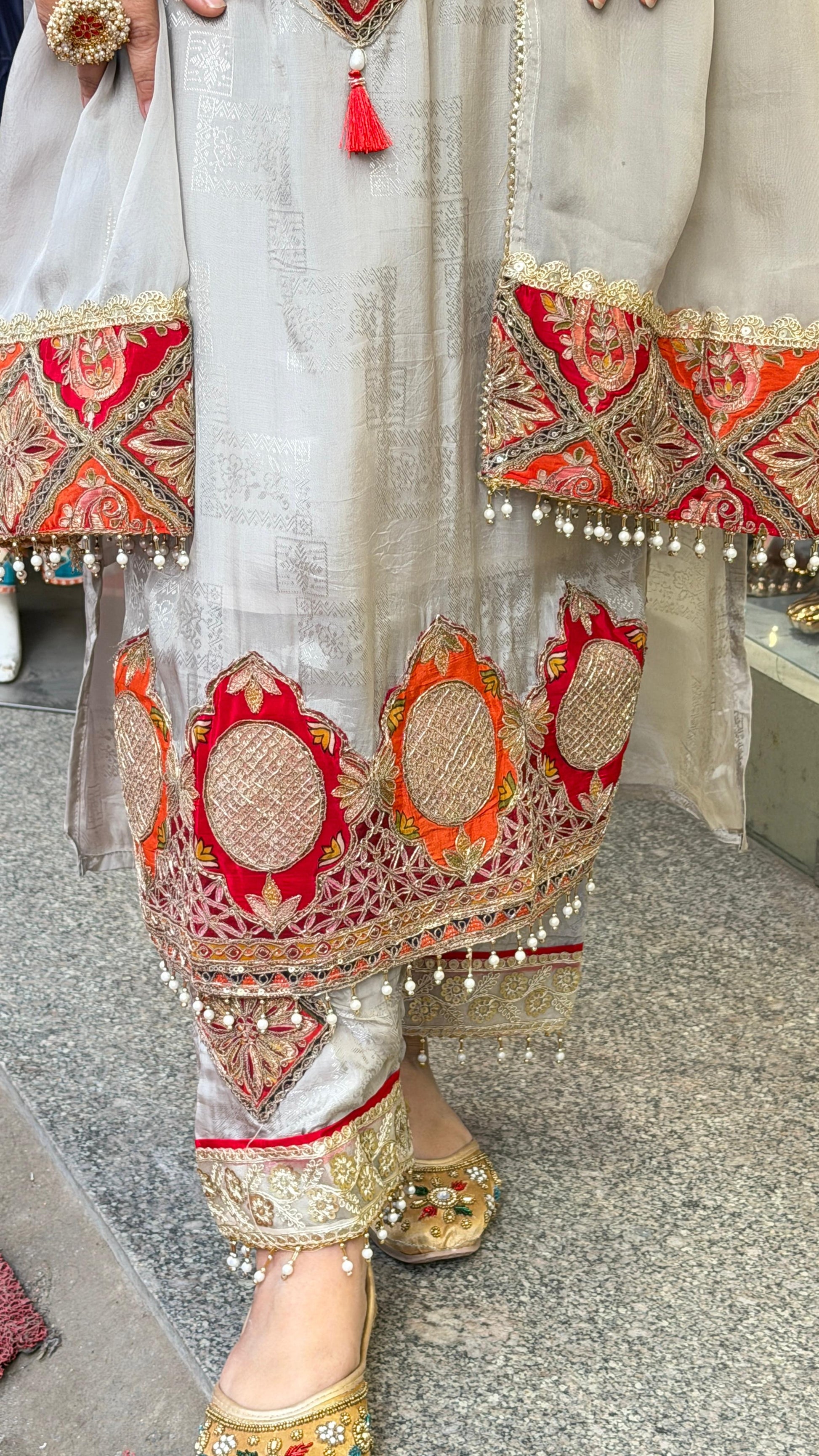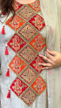 This beautifully designed kurta features intricate diamond-pattern mirror work with phulkari-inspired embroidery, highlighted by tassel detailing for added grace. The subtle ivory base enhances the vibrant red accents, while the embroidered sleeve cuffs and hemline add a luxurious traditional touch.