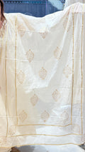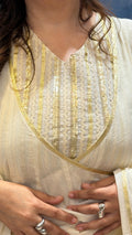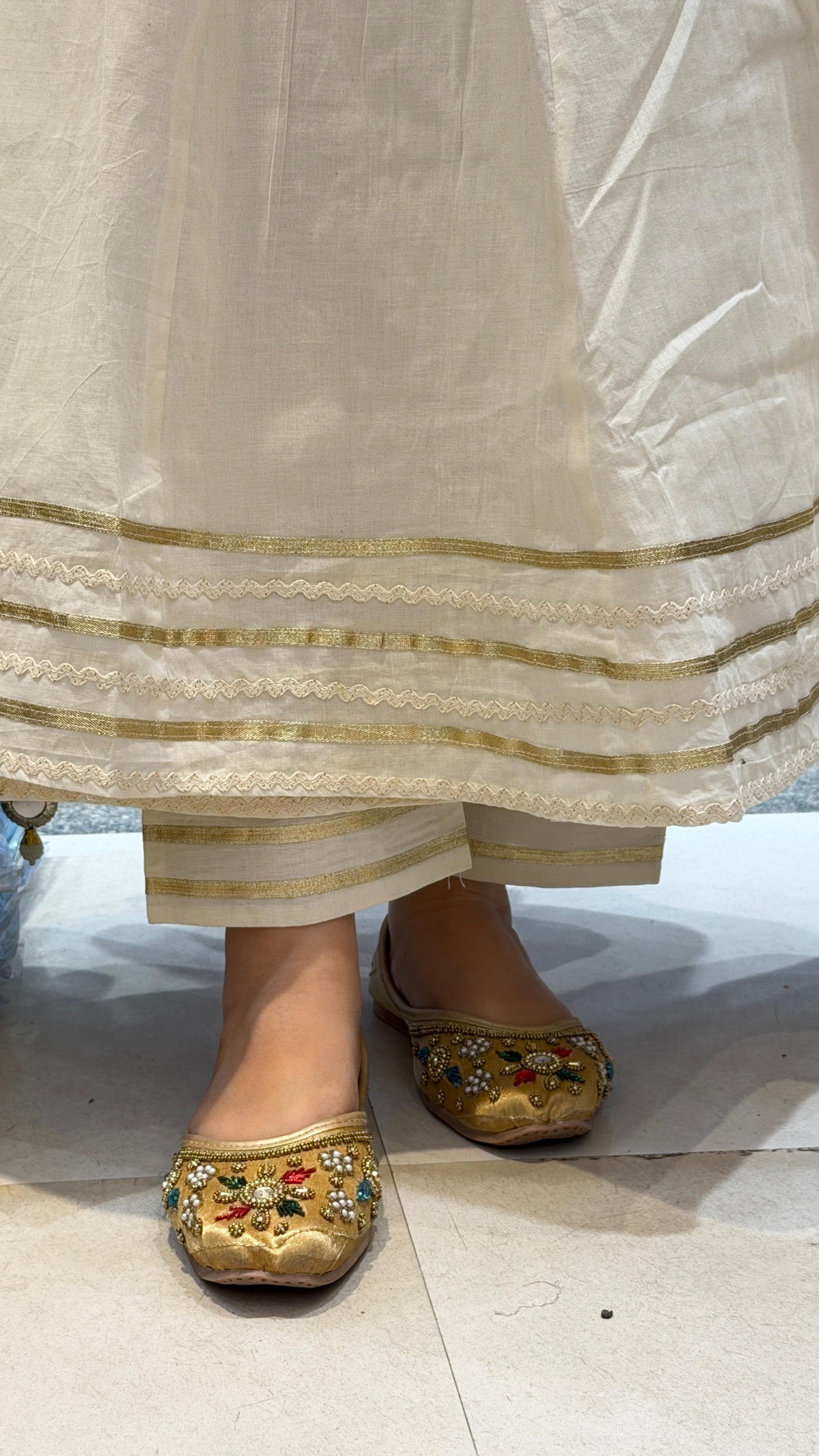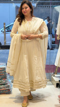 Featuring a flowy ivory Anarkali with subtle gold detailing on the neckline and borders, this ensemble is paired with a beautifully coordinated dupatta highlighted with delicate prints and fine gold accents. The soft silhouette drapes elegantly, making it ideal for festive occasions, poojas, weddings, and intimate celebrations.