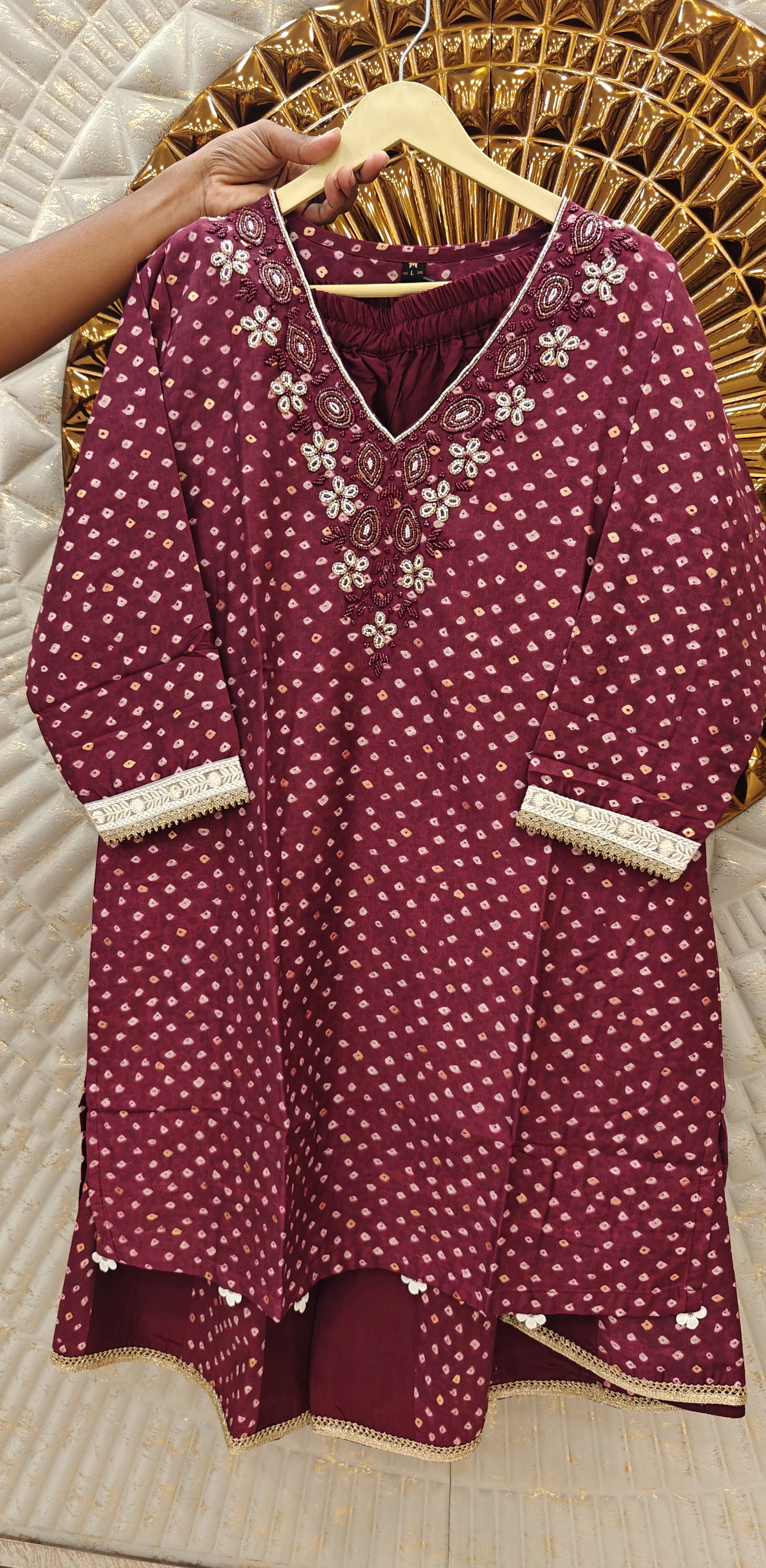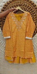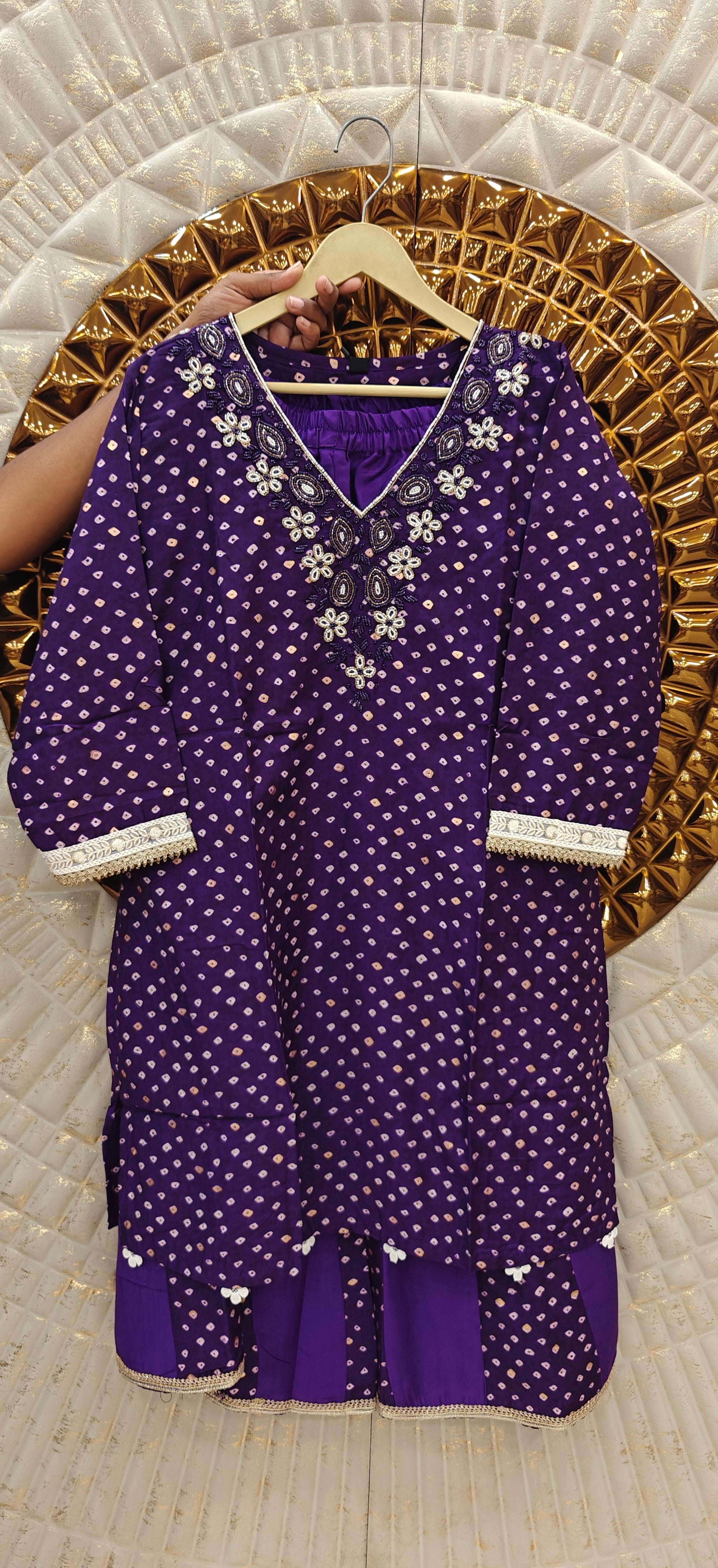 Embrace the charm of traditional artistry with our Jaipuri Kalli Coord Set. Featuring a deep purple base adorned with delicate Jaipuri bandhani prints and intricate floral embroidery on the neckline, this set exudes cultural elegance. The long, flowy kurta is paired with matching straight pants, creating a harmonious blend of style and comfort.