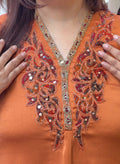 Rich kesari orange kurta with detailed neckline embroidery
