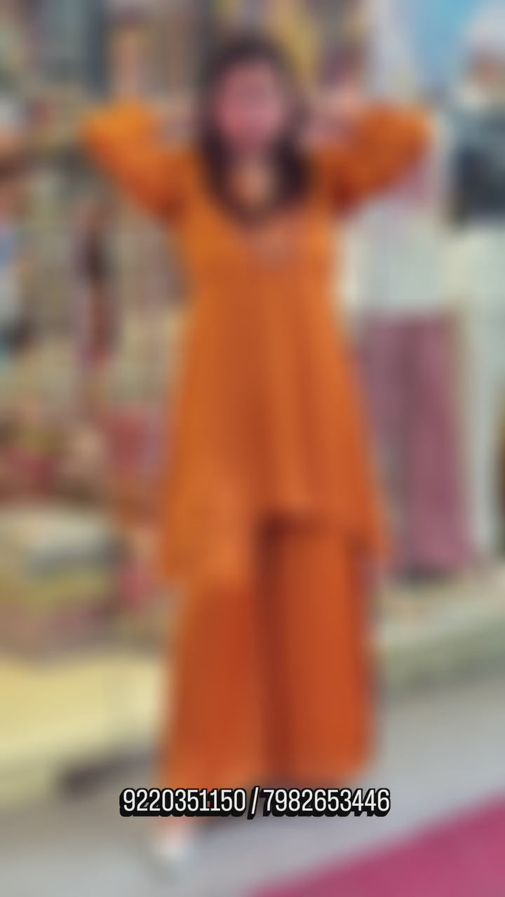 Crafted in a rich kesari orange hue, the kurta features intricate embroidery along the neckline, adding a refined statement without overpowering the silhouette. The soft, flowy kurta is paired with straight-fit pants, offering ease of movement and a flattering drape—perfect for festive gatherings, celebrations, and elegant day events.