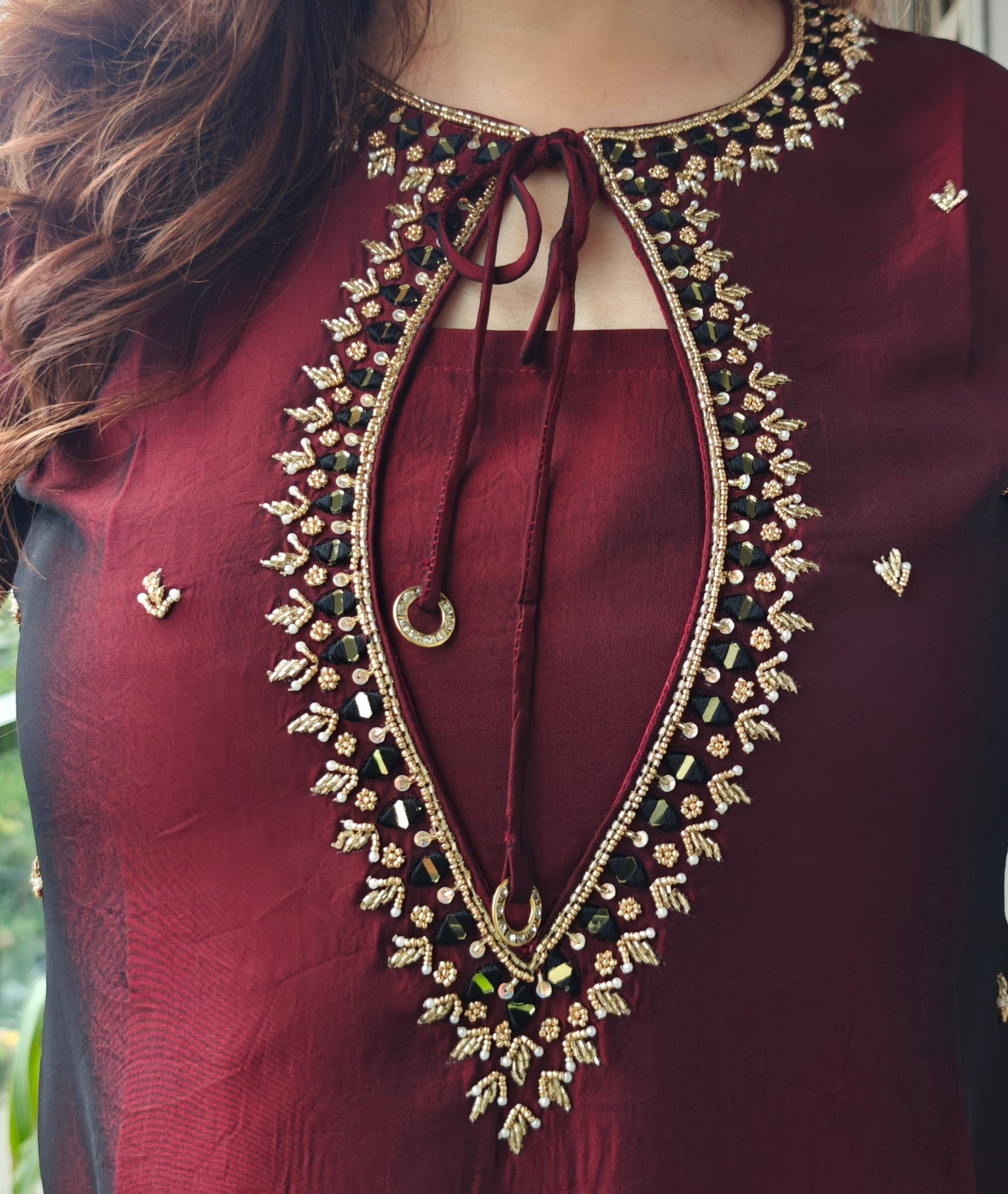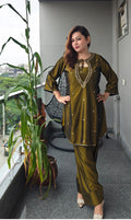 Grace meets tradition with this stunning Maroon Farshi Salwar Set, designed to make a statement of effortless charm. The rich maroon kurta is beautifully highlighted with intricate golden embroidery along the neckline and dainty motifs across the body, giving it a regal appeal. Paired with the signature wide-legged Farshi salwar, this ensemble brings together comfort and grandeur, making it perfect for festive gatherings and elegant evenings.
