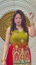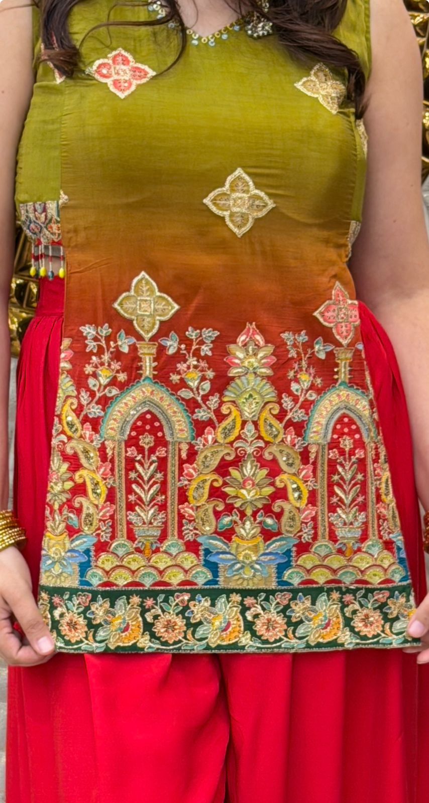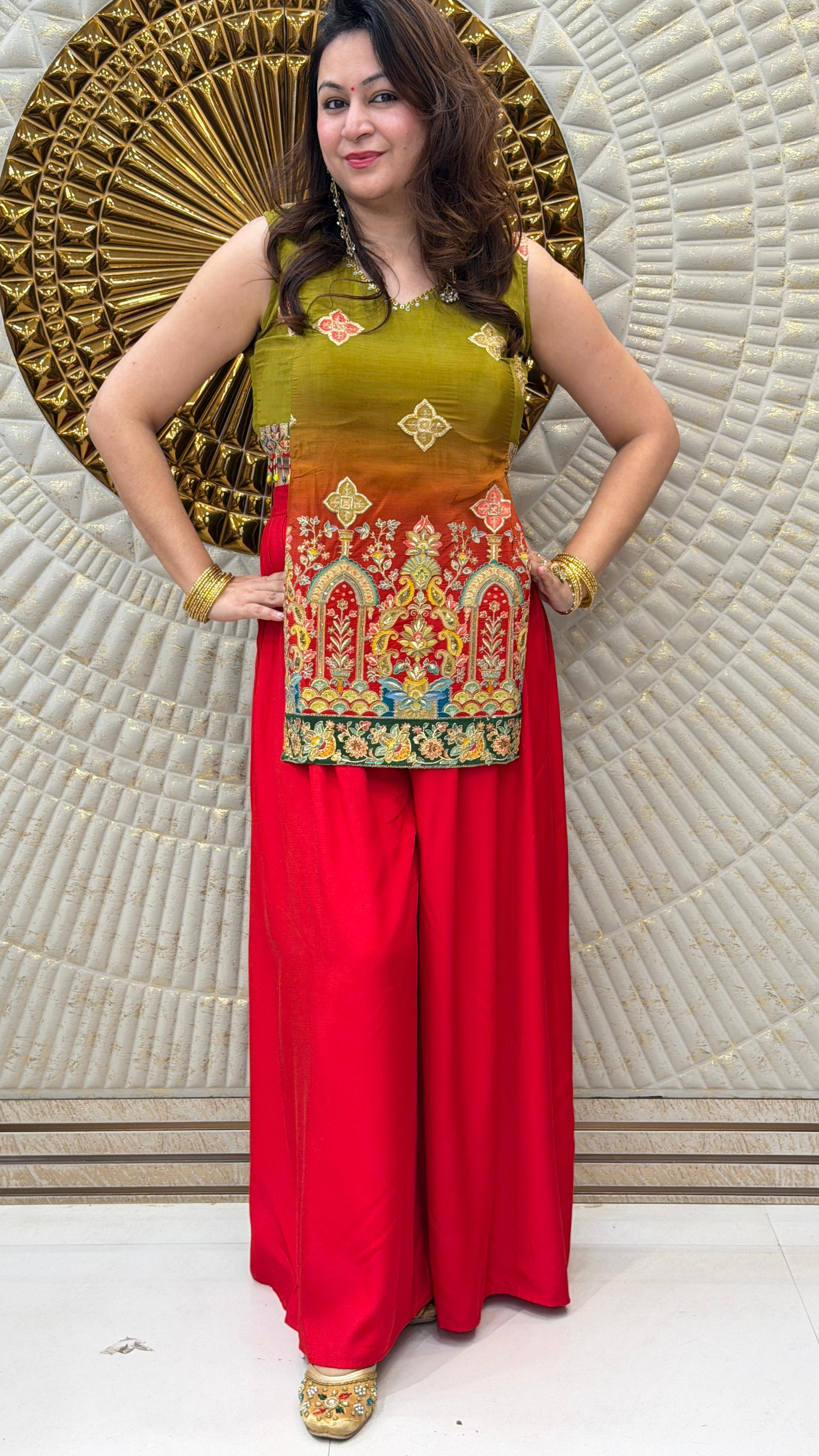 The sleeveless kurta features a beautiful ombré blend of olive green to warm rust tones, highlighted with ornate architectural-inspired embroidery along the hemline. Paired with vibrant red palazzo pants, this ensemble balances tradition with contemporary flair—perfect for festive evenings, wedding functions, and celebratory gatherings.