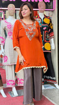 Designed with a graceful asymmetrical hemline, the kurta features intricate neckline embroidery and delicate lace edging on the sleeves and hem for a polished finish. Paired with flowy neutral palazzo pants, this set offers comfort with a luxe look — perfect for festive gatherings, dinners, and semi-formal occasions.