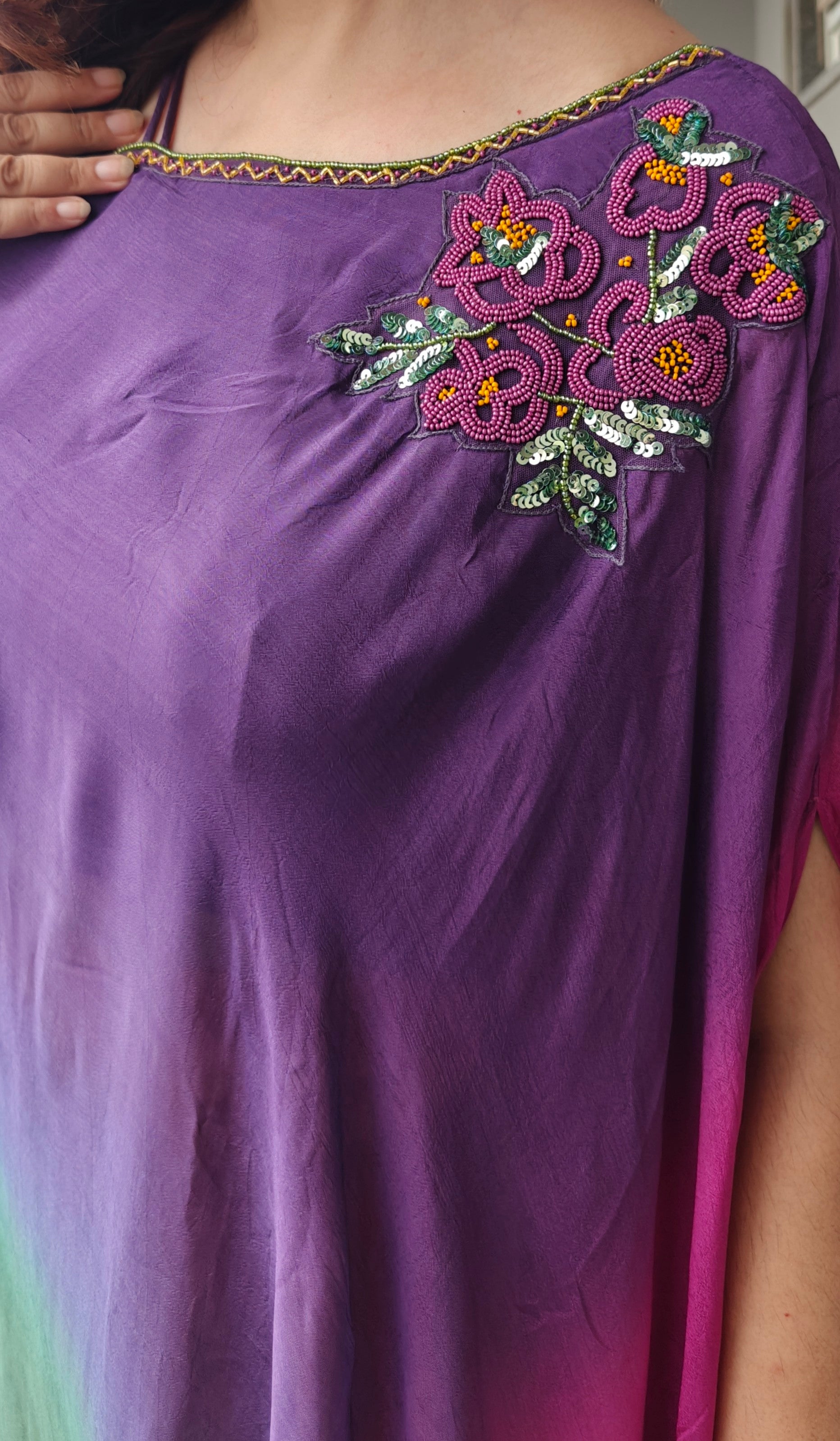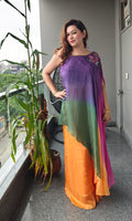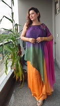 Celebrate colors in motion with our Mitwa Ombre Coord Set, a stunning blend of elegance and vibrance. The asymmetrical one-shoulder overlay flows in enchanting shades of violet, magenta, and emerald green, gracefully layered over a radiant sunset-orange skirt. Adorned with delicate floral embroidery at the neckline, this ensemble beautifully balances contemporary flair with festive charm.
