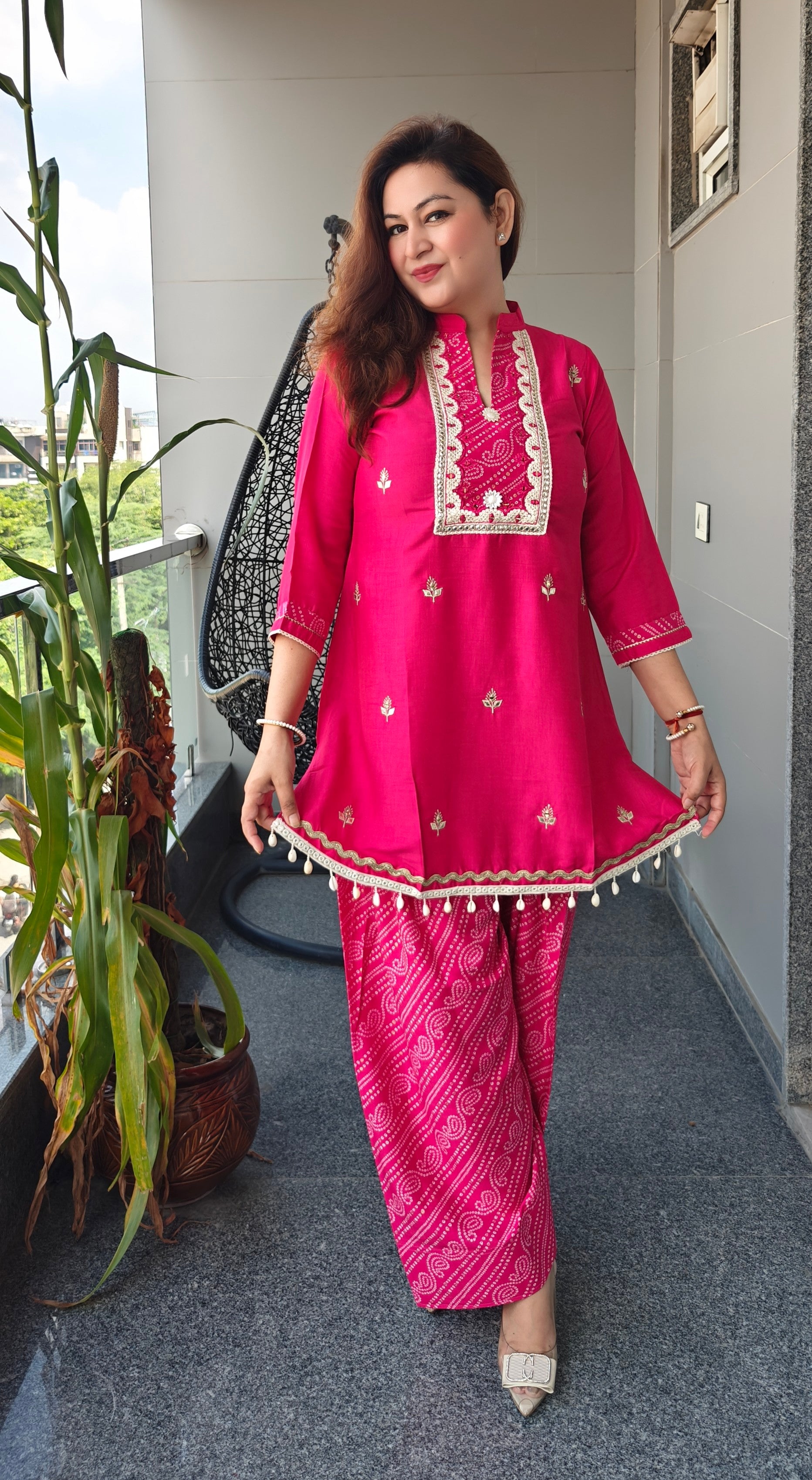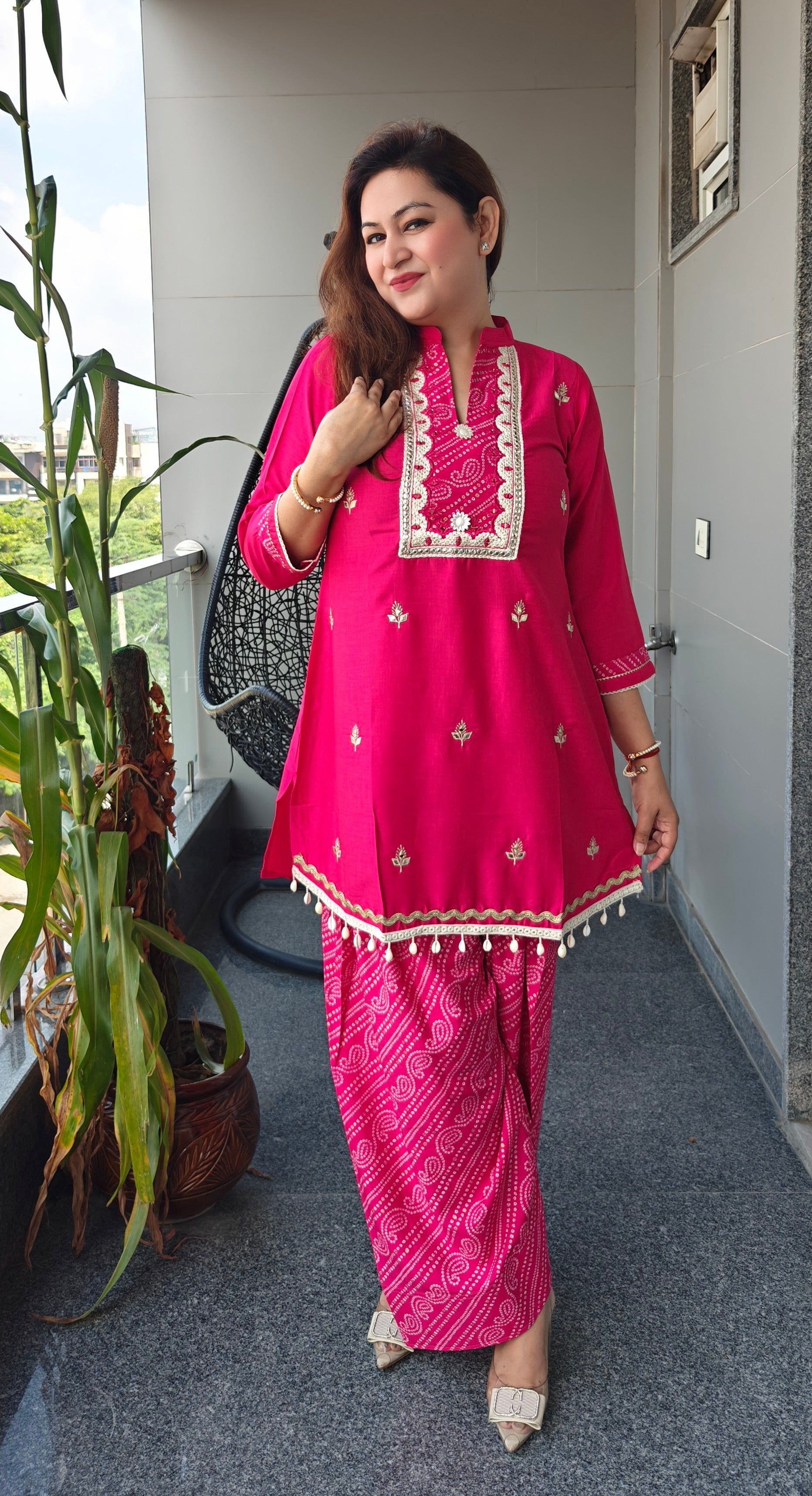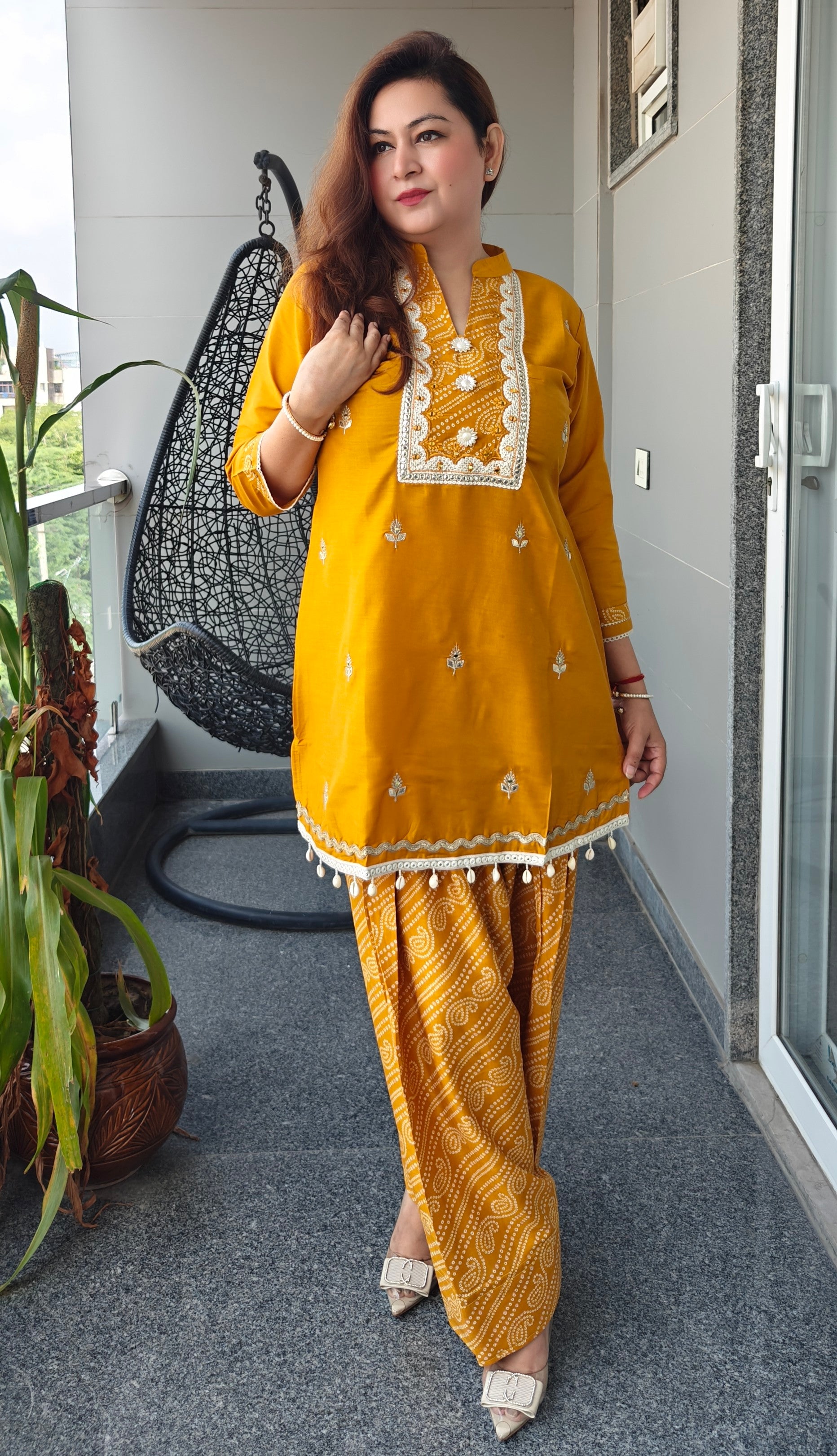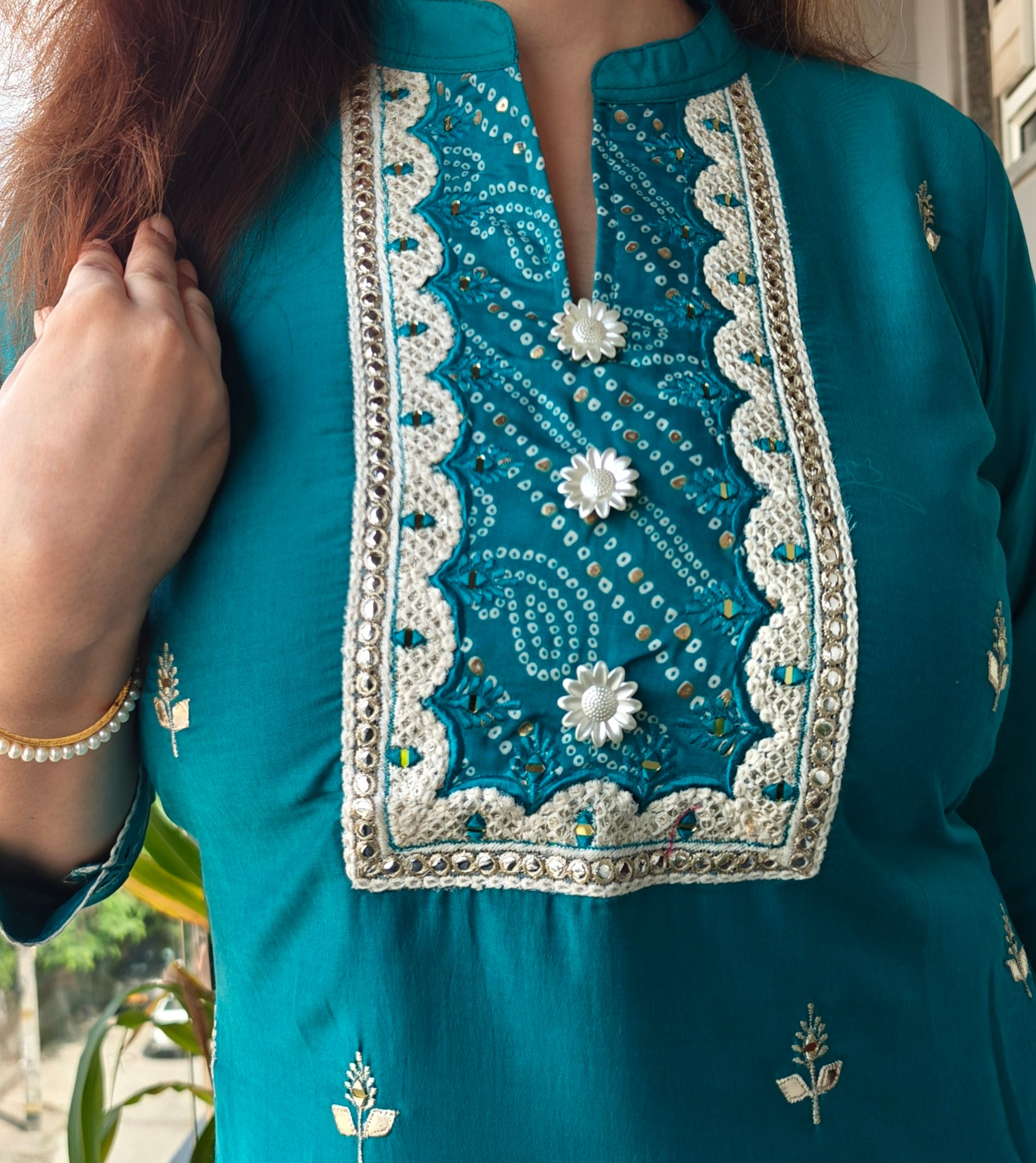 Celebrate tradition with a contemporary twist in our Navratri Coord Set, featuring a vibrant turquoise base adorned with intricate mirror work and bandhani print accents. The kurta flaunts delicate embroidered motifs and a playful tassel hem, paired seamlessly with comfortable bandhani printed pants that add a touch of ethnic charm.