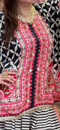 The statement kaftan-style kurta features intricate ethnic prints in rich reds and blacks, highlighted with delicate embellishment along the neckline and hem. Paired with striped dhoti-style pants, this set offers effortless movement, comfort, and standout style—perfect for festive days, cultural gatherings, and intimate celebrations.