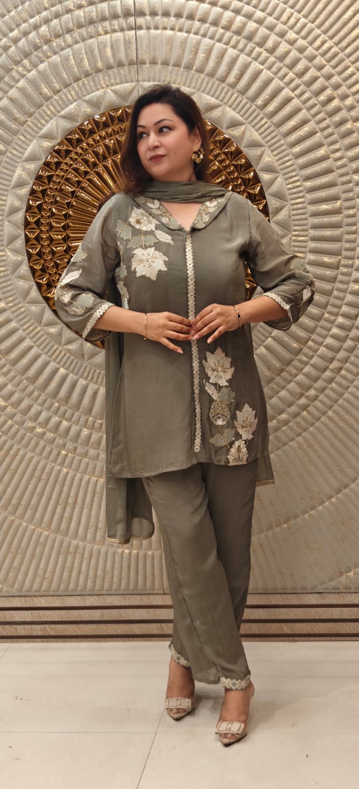 Step into understated luxury with this graceful olive coord set, crafted for women who love refined festive and occasion wear. The soothing tone paired with delicate floral embroidery creates a timeless ethnic statement.