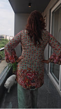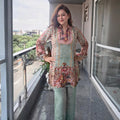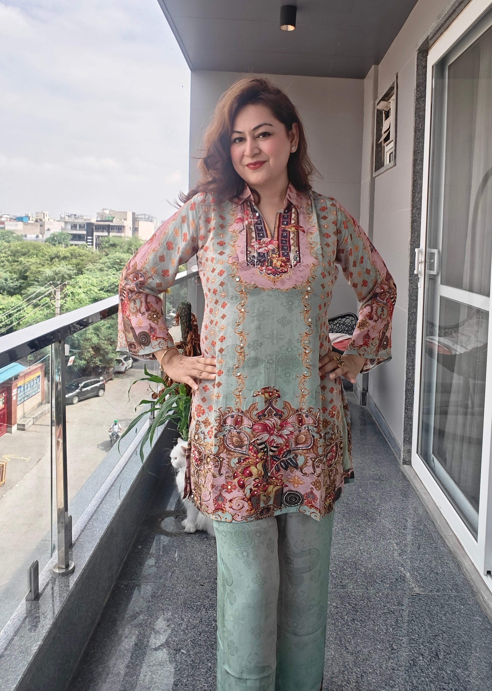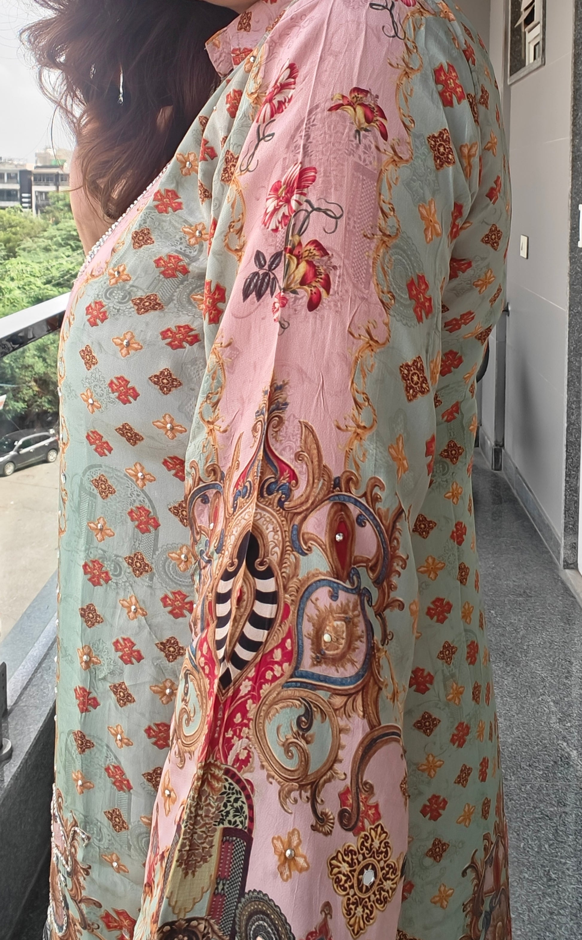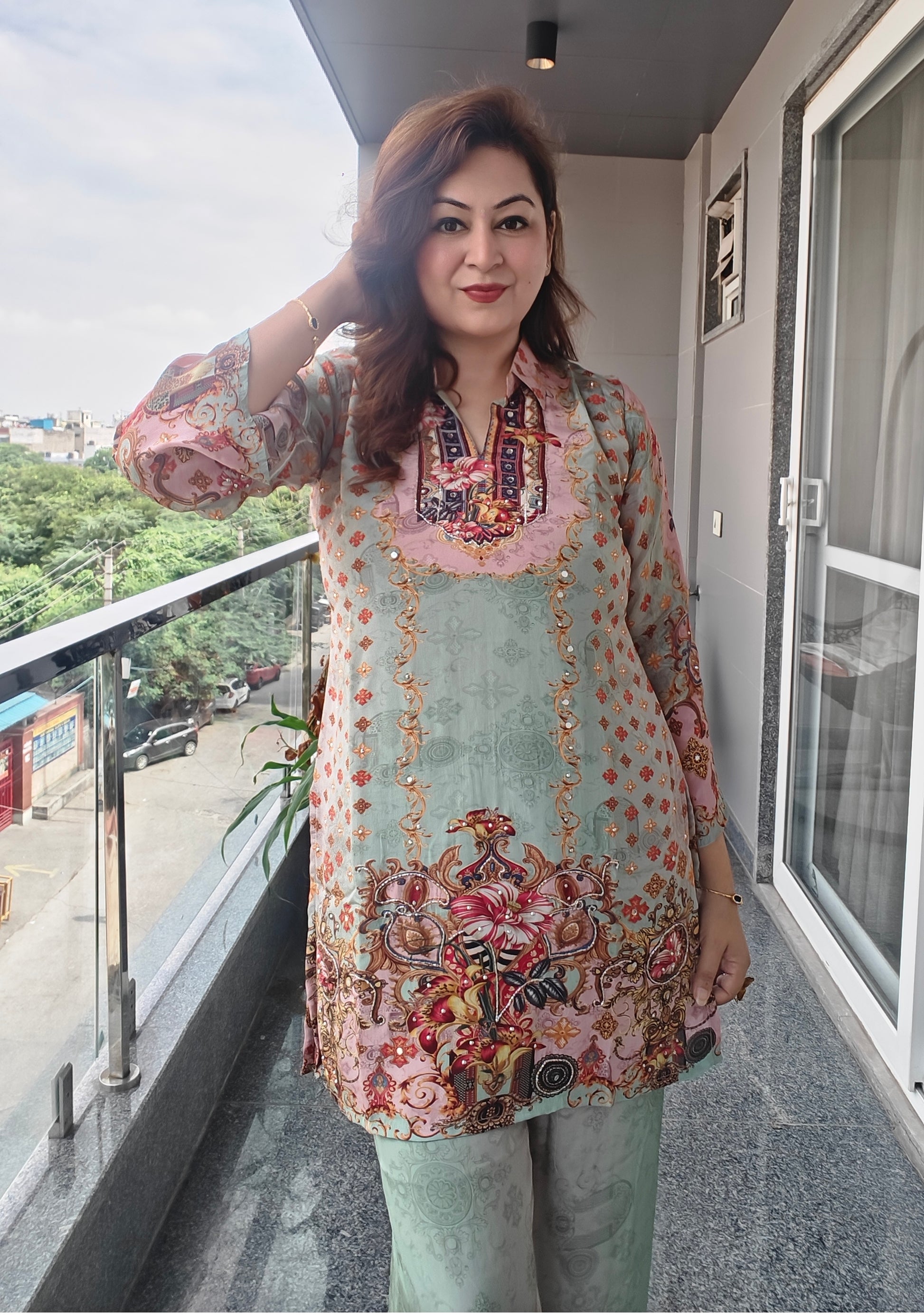 Step into elegance with the Pastel Garden Crepe Coord Set, a stunning blend of comfort and ornate design. The kurta features a regal floral motif in shades of blush pink, gold, and deep coral, all set against a soothing mint base. Intricate digital prints and mirror embellishments add a touch of festive glam, while the matching straight pants keep it balanced and breathable.