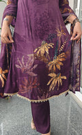 Turn heads with the Royal Orchid Crepe Long Suit, a stunning blend of grace and sophistication. Crafted in luxurious crepe fabric, this deep plum suit features elegant floral prints in earthy gold tones, adding a regal charm to its flowy silhouette. The long kurta is finished with delicate lace detailing at the hem and sleeves, paired with matching bottoms and a printed dupatta for a complete look. Perfect for festive occasions, evening gatherings, and cultural events, this outfit combines comfort with timeless style.