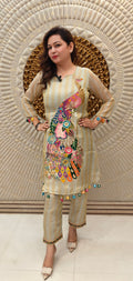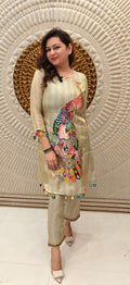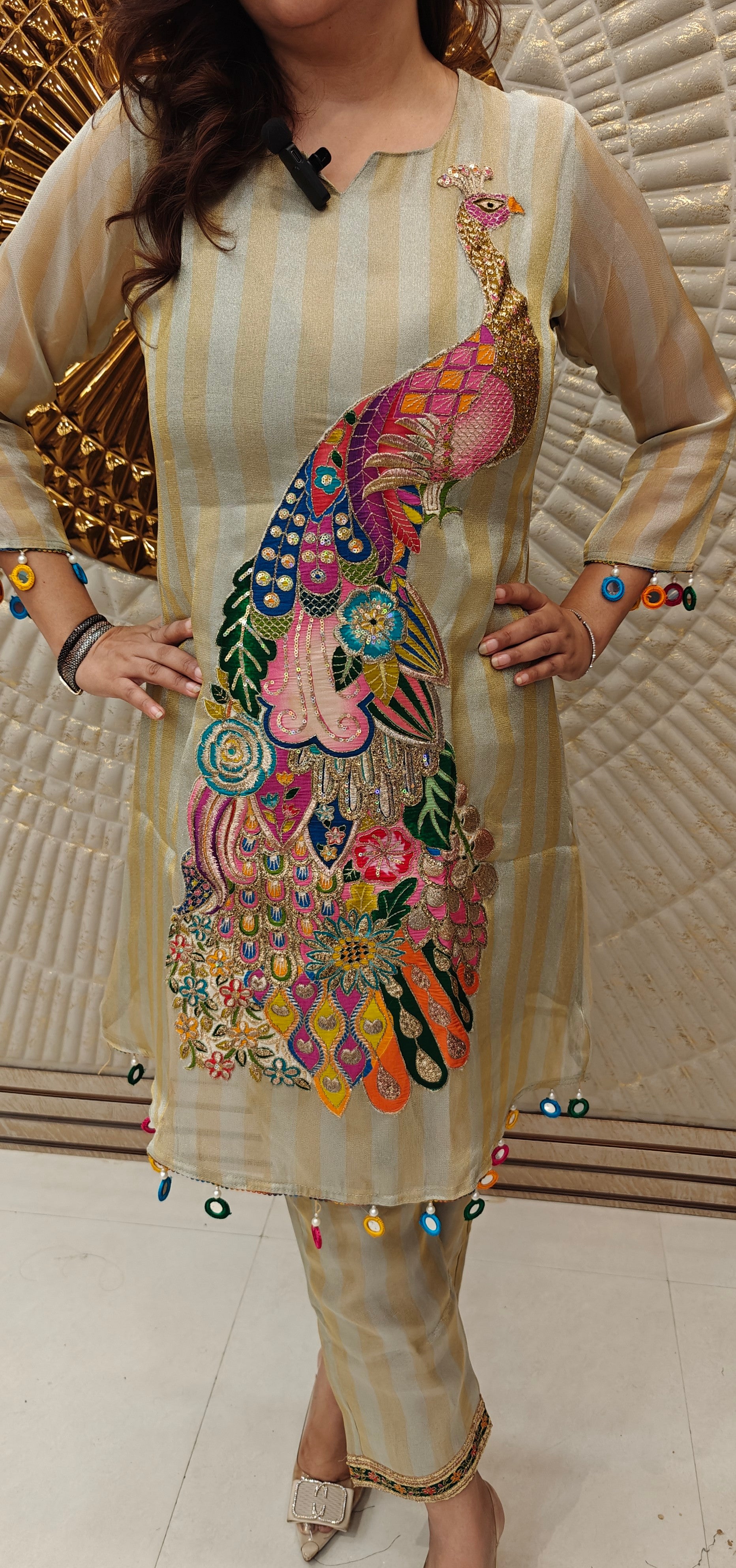 Celebrate tradition with a splash of contemporary flair in our Tissue Organza More Coord Set. The kurta features a stunning, intricately embroidered peacock motif in vibrant colors, perfectly standing out against a subtle striped tissue organza fabric. Paired with matching straight pants, the ensemble is elevated by colorful tassel accents that add playful charm. Ideal for festive occasions, Navratri celebrations, or family gatherings, this coord set ensures you shine with elegance and grace.