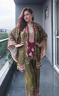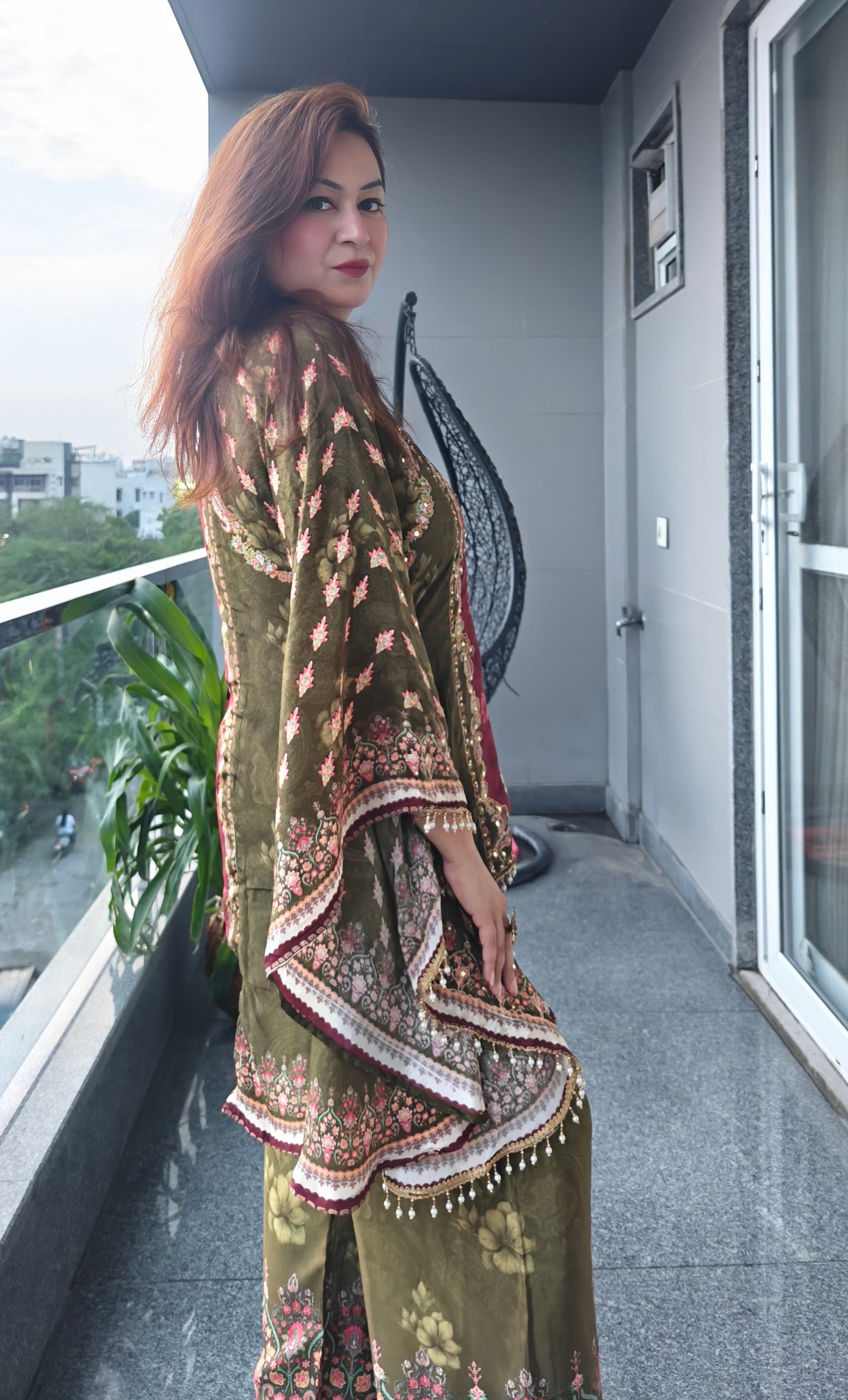 Elegance meets heritage in this luxurious Zaitoon Kaftan Coord Set. Made from rich crepe fabric, it showcases intricate Mughal-inspired prints in deep olive green, maroon, and soft blush tones. The flowing kaftan top features ornate borders, mirror detailing, and ethnic floral motifs, paired with coordinated wide-leg pants β making it a standout for festive soirΓ©es, mehendi nights, or elegant evening gatherings.