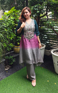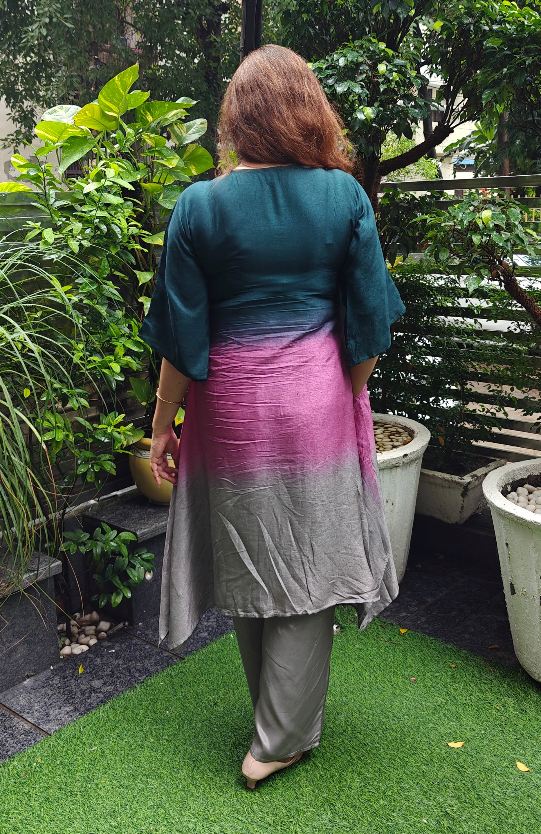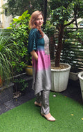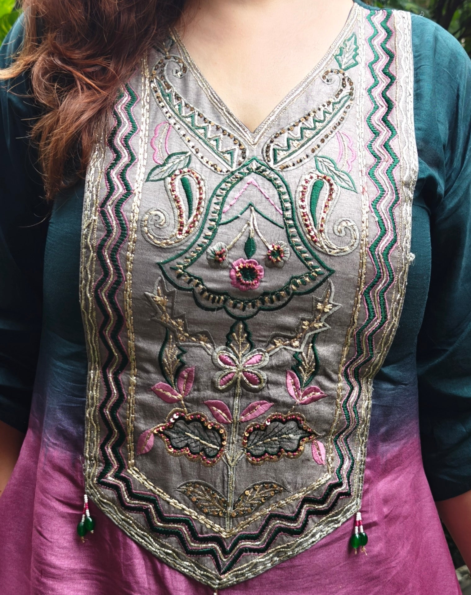 An elegant blend of artistry and sophistication, the Zinnia Ombre Coord Set features a striking gradient from deep magenta to dove grey, paired with rich teal sleeves and trousers. The kurta’s neckline and yoke are adorned with intricate embroidery in floral and paisley motifs, highlighted with beads and tassels for a touch of movement. Perfect for festive gatherings or statement daywear.